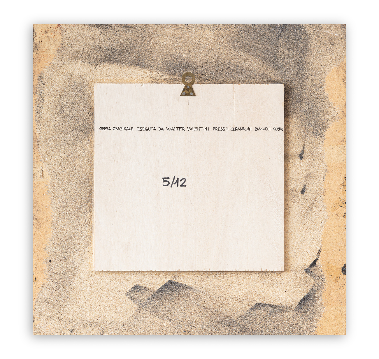 Iscrizione "Opera eseguita da Walter Valentini presso le Ceramiche Biagioli Gubbio" al retro