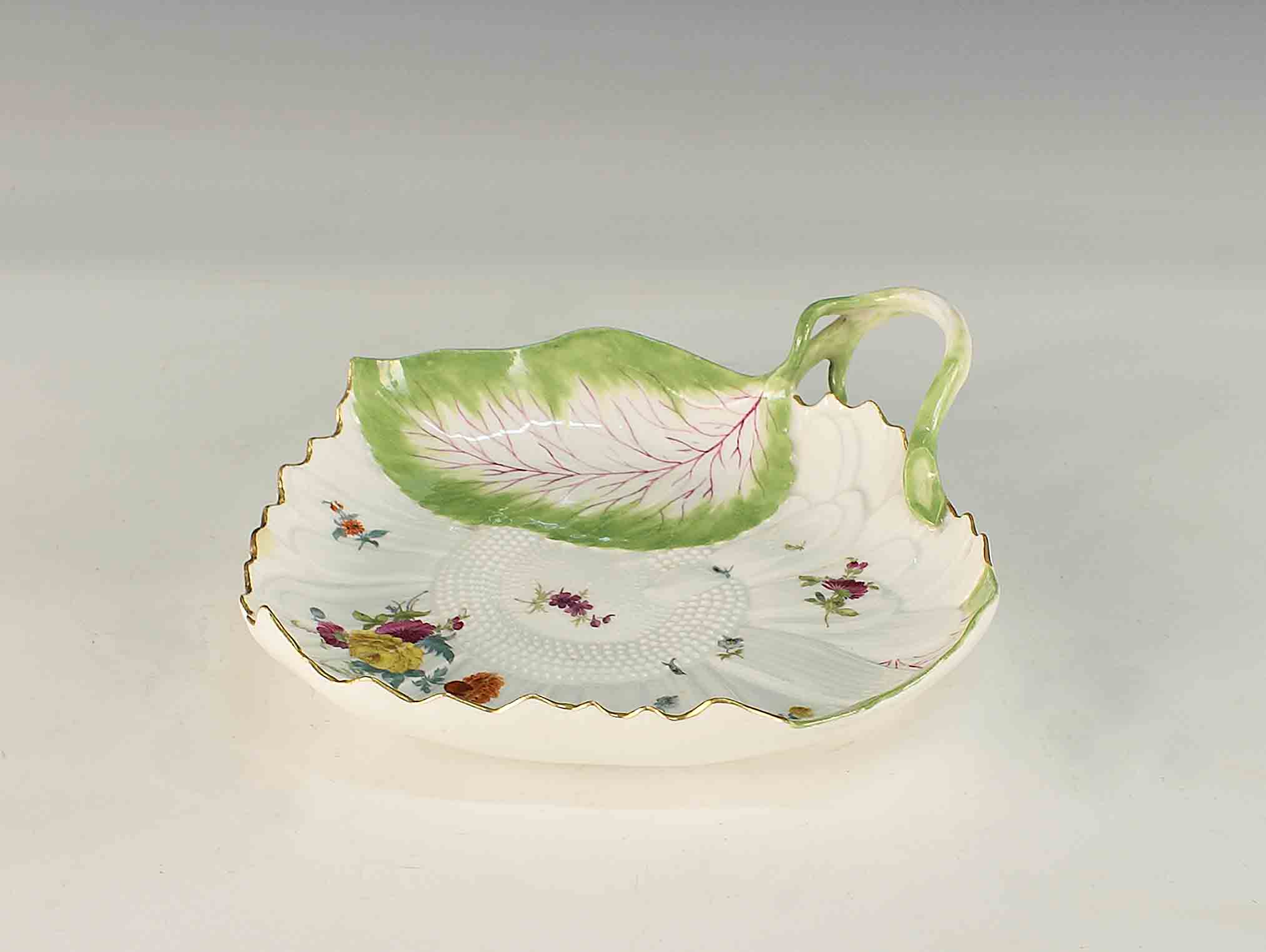 Cestino a foglia in porcellana dipinta a policromia e decorata a motivo floreale poggiante su quattro piedini, Meissen, inizi del XX secolo, cm. 24x22,5.
