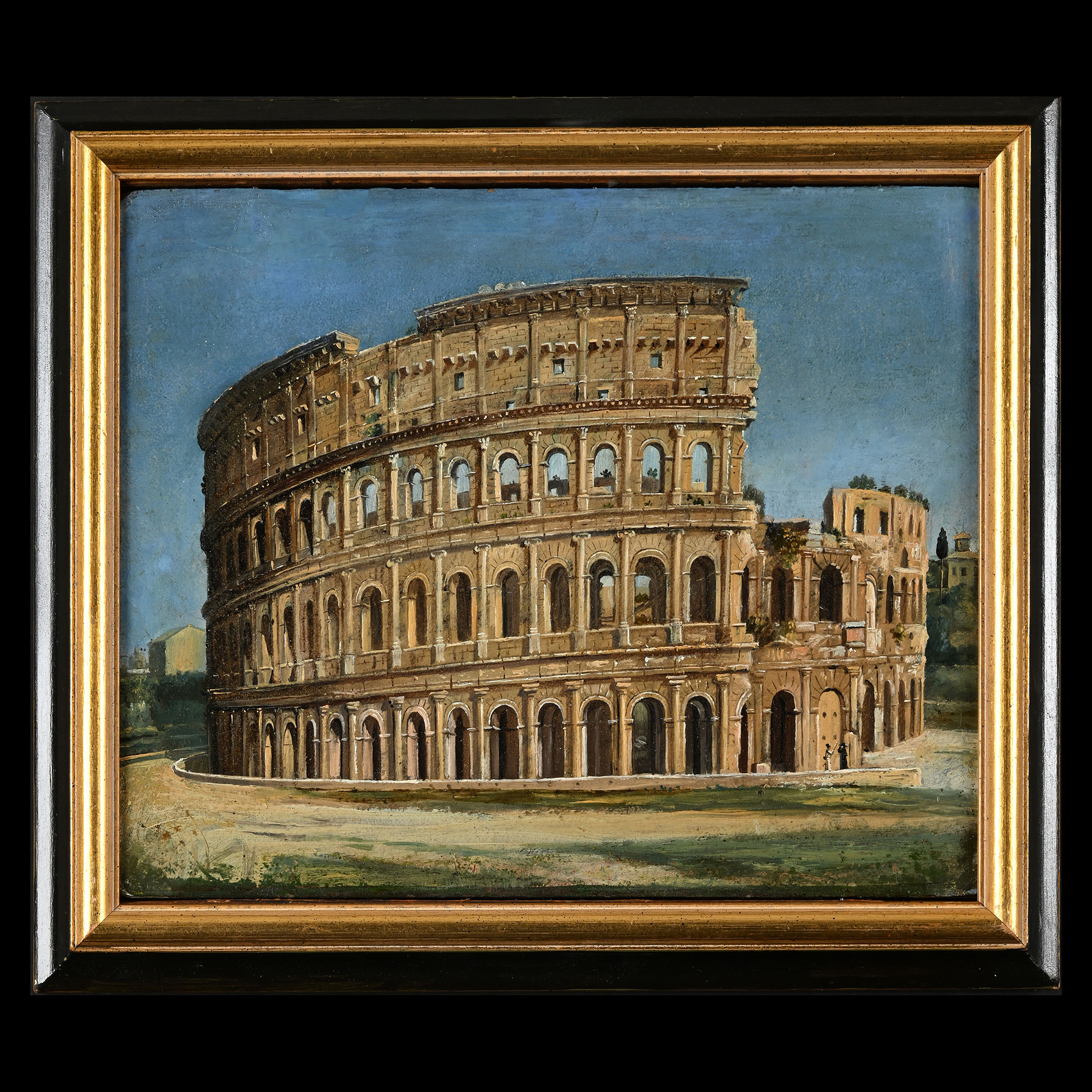 Pittore romano della fine del XVIII secolo, Il Colosseo Tempera su carta applicata su tavola, dimensioni ext. 27,5x31, int. 22x25,5 cm.