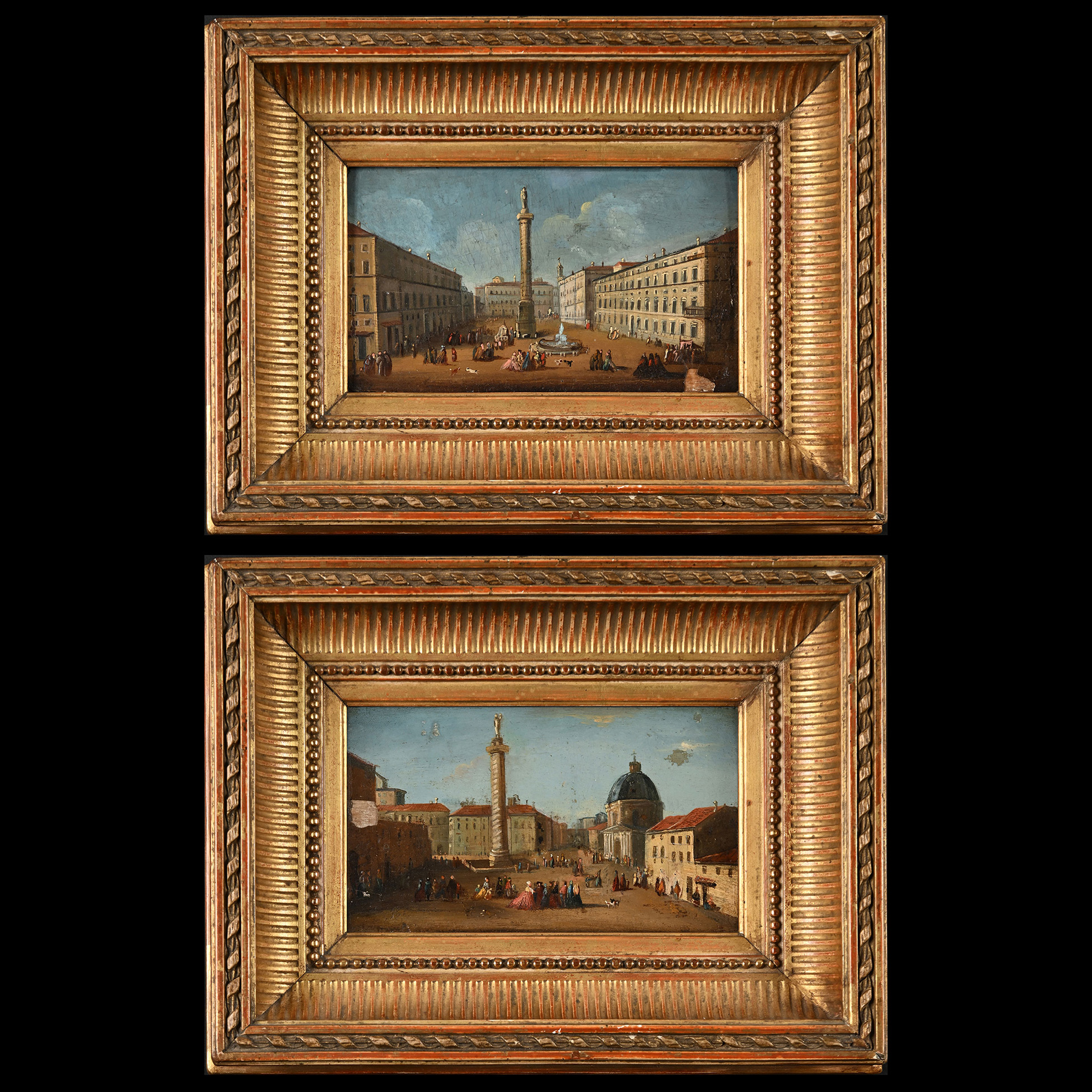 Pittore romano della seconda metà del XVIII secolo, Coppia di vedute della Colonna Traiana e della Colonna Antonina Olio su tavola, dimensioni ext.22,5x30, int. 10x17,5 cm. cad.