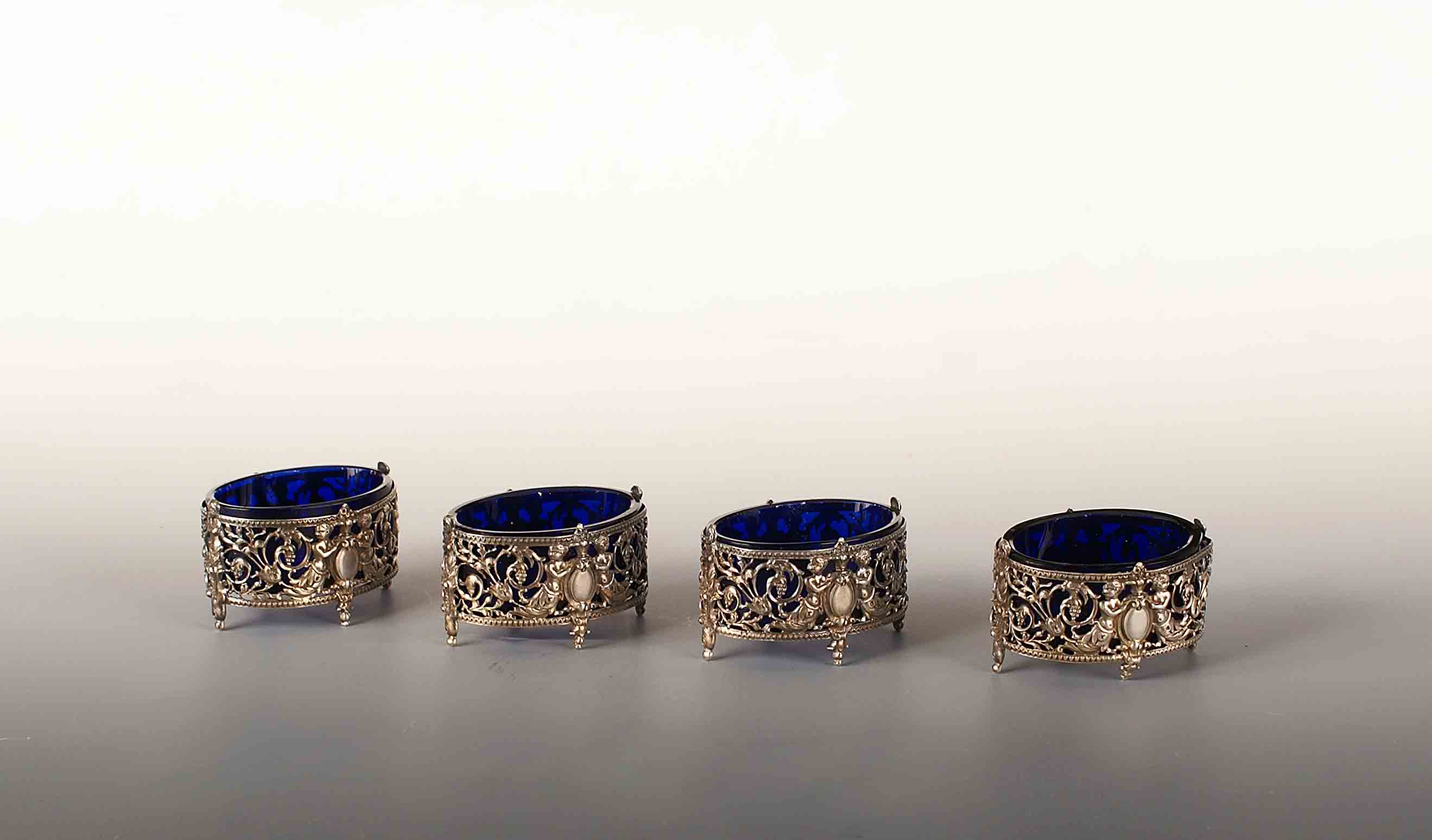 Quattro salierine in argento sbalzato con interni in opalina, Francia XIX...