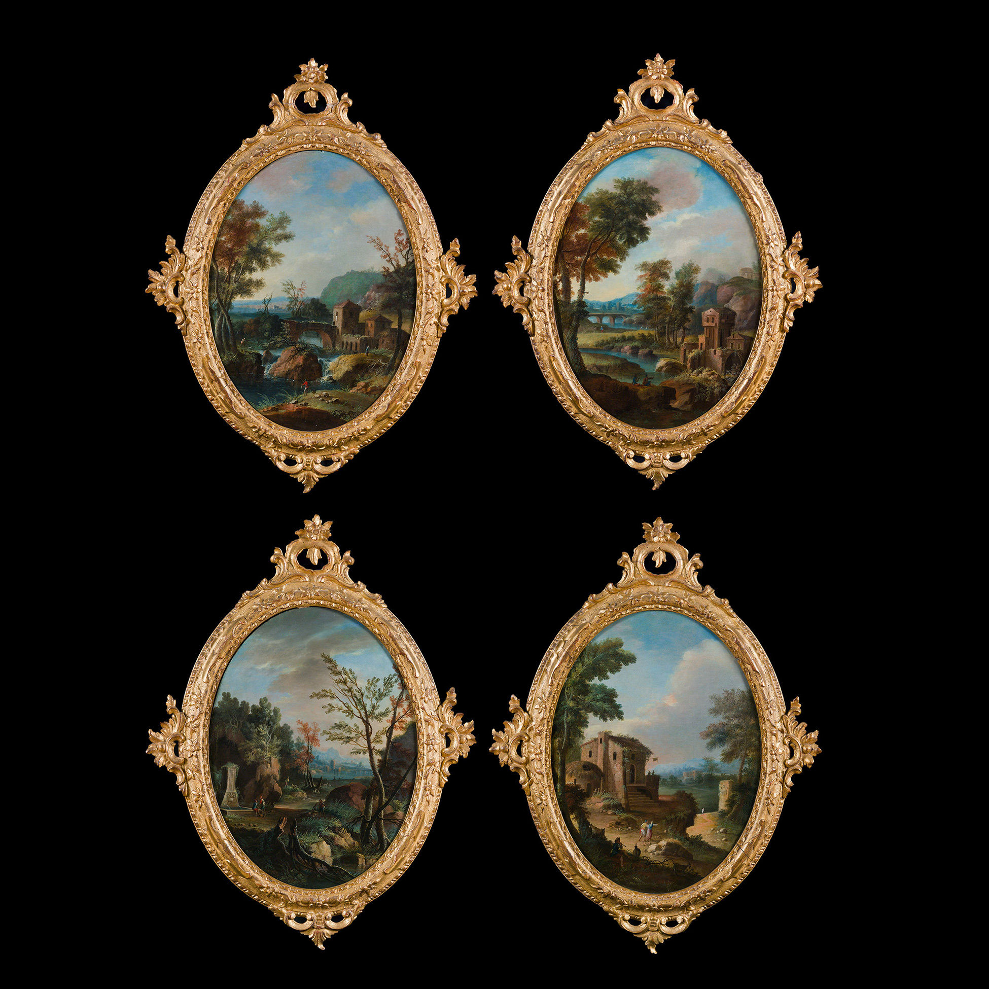 Vittorio Amedeo Cignaroli (Torino 1730 – 1800), Quattro paesaggi con figure Comunicazione scritta: Mina Gregori e Carlo Volpe. Olio su rame, dimensioni 54x40 cm. cad.