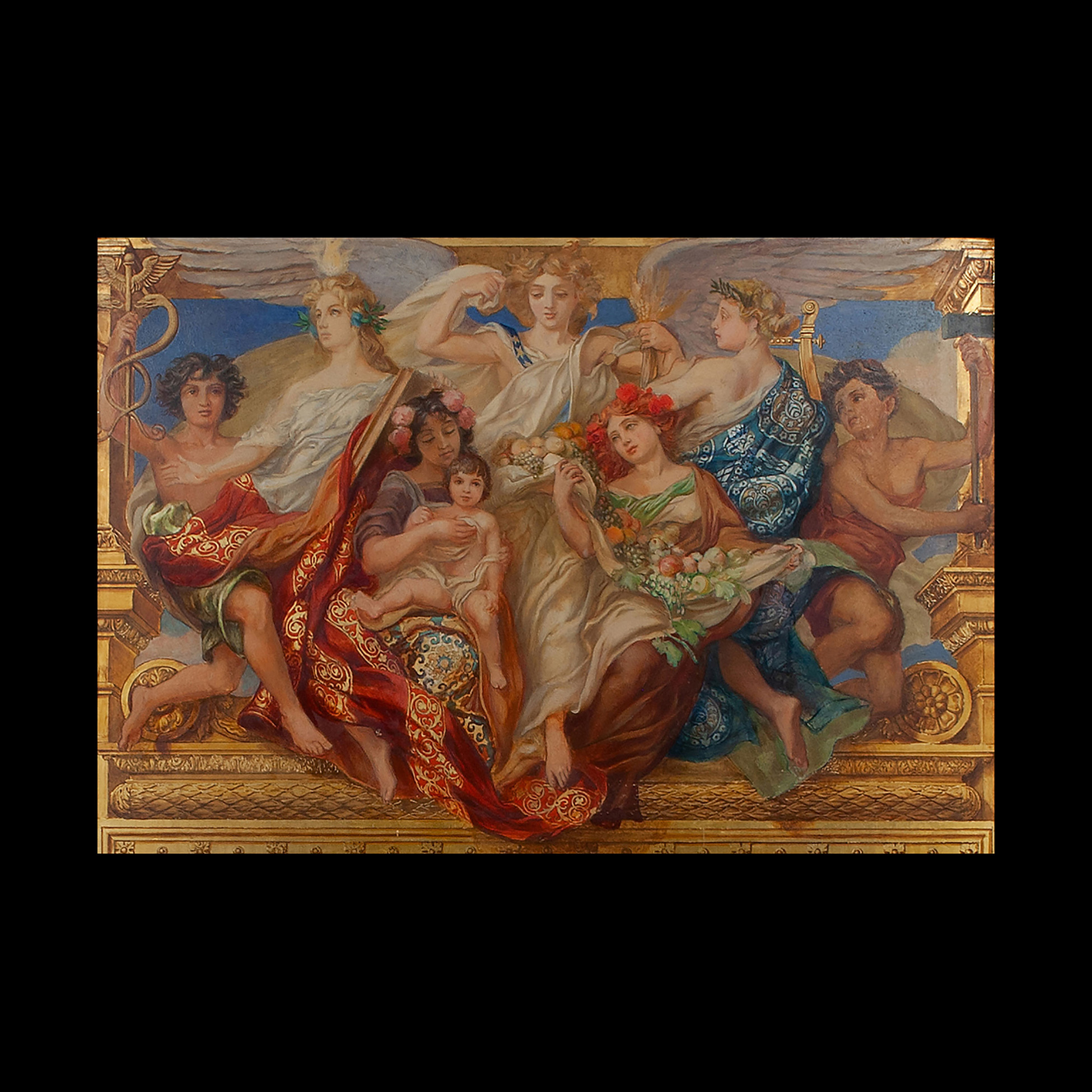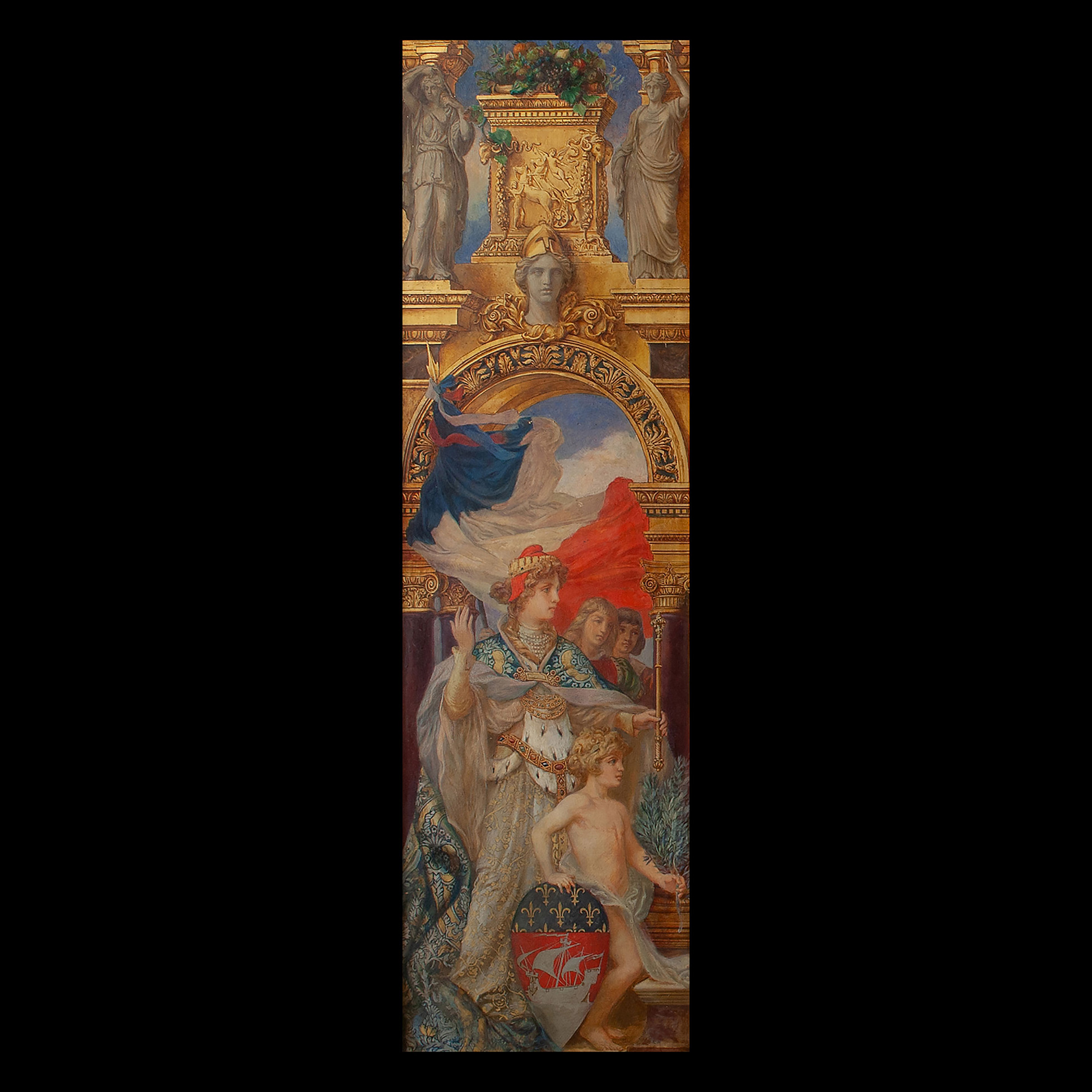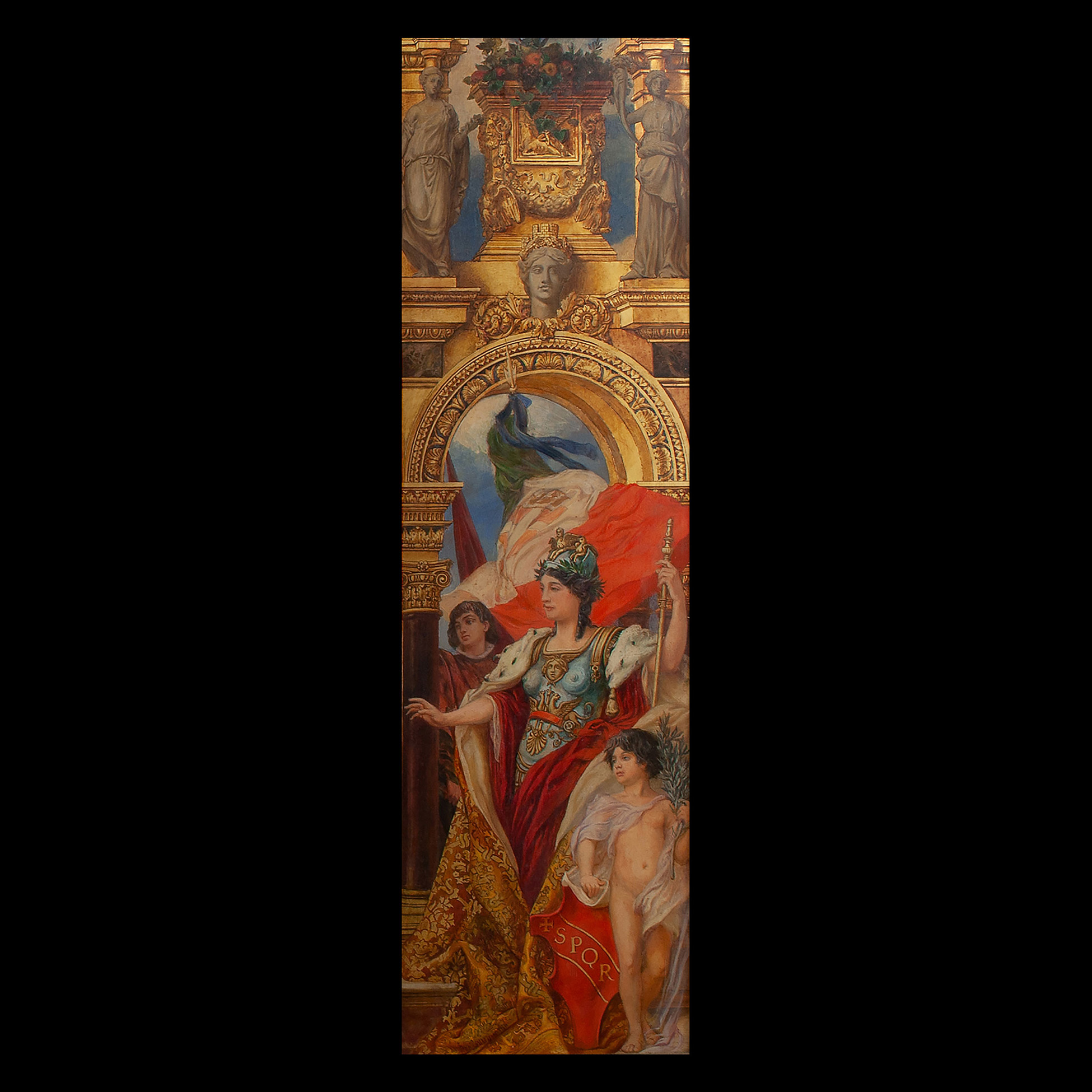 Giuseppe Cellini (Roma 1855 - 1940), Trittico ad ante celebrativo, dono della città di Roma al presidente francese Émile Loubet nell'anno 1904 Di grande impatto visivo, il trittico fu eseguito dall'artista romano su commissione del comitato d'onore della città - composto da artisti e maggiorenti della capitale - i cui nomi sono riportati nei sei pannelli a contorno della grande allegoria. Il pannello centrale è composto da una grande allegoria della pace, nella parte sottostante è riportata la dedica al presidente francese Émile Loubet in visita a Roma nel 1904, dettata dal poeta Enrico Panzacchi. Loubet fu presidente dal 1899 al 1906 e il viaggio nella capitale italiana fu fondamentale per la distensione dei rapporti politici e coloniali tra le due nazioni; i due pannelli laterali raffigurano l'amicizia delle due nazioni: due allegorie di Parigi e Roma recano con loro due fanciulli che reggono rami di ulivo. Il trittico venne esposto al pubblico negozio di Corso Umberto I a Roma, e l'evento è documentato con dovizia di particolari in numerose pubblicazioni dell'epoca. Olio su tavole incernierate, dimensioni chiuso 135x88x11, aperto 135x144x4,5 cm.