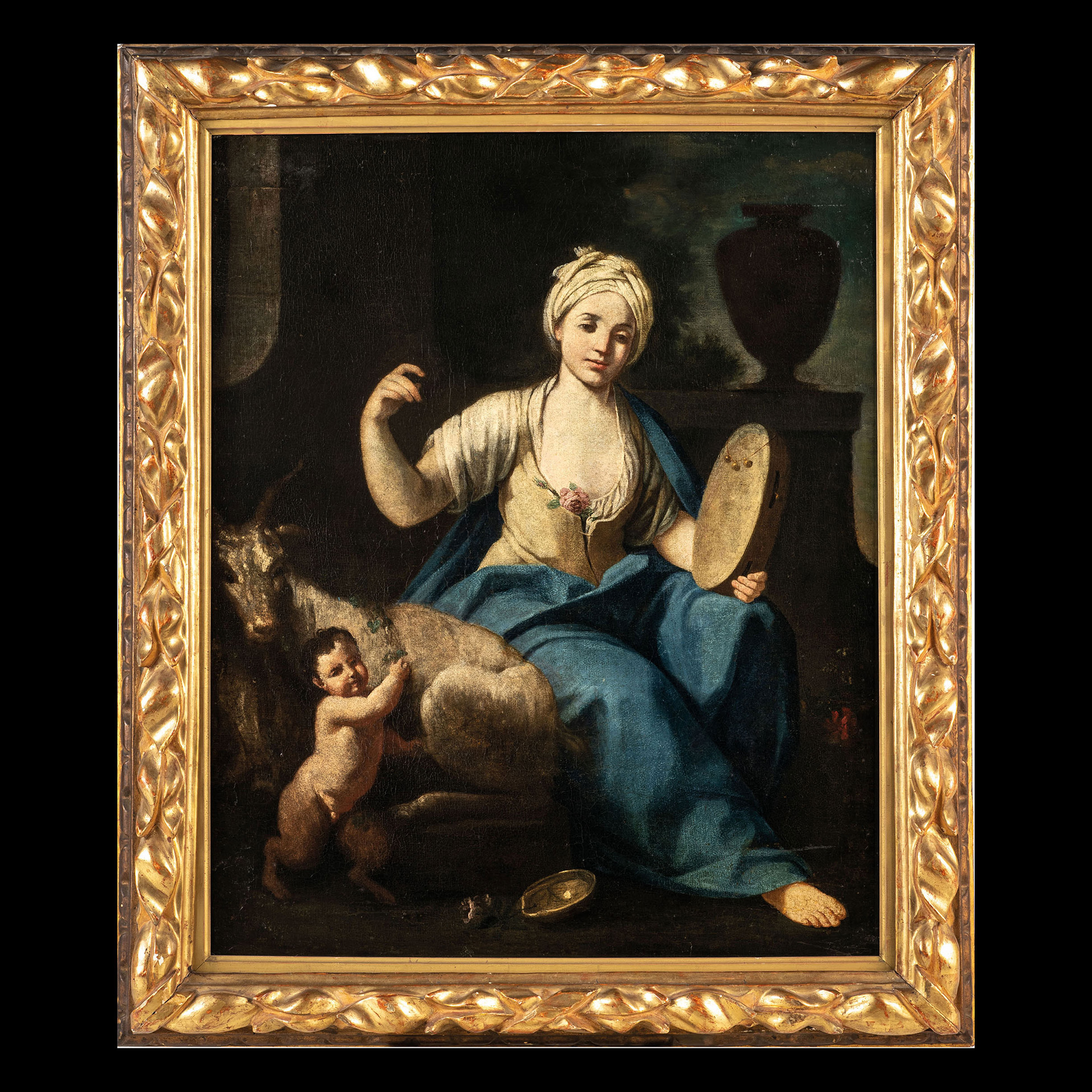Giuseppe Gambarini (Bologna 1680 - Casalecchio di Reno 1725), Allegoria della Musica con capra e satiretto Olio su tela, dimensioni 74,5x62 cm.