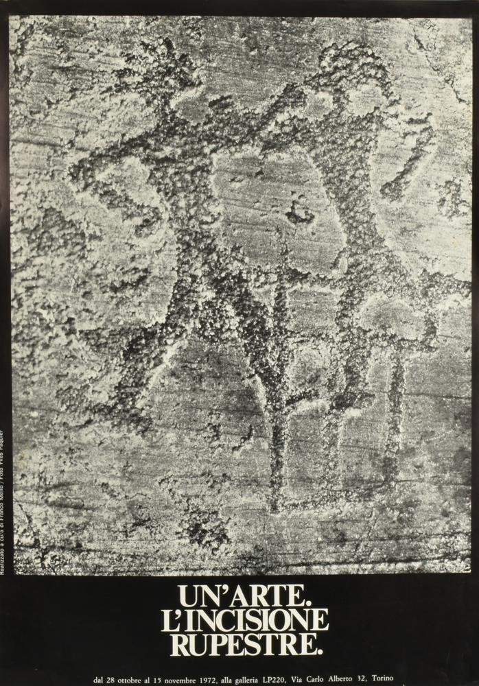 manifesto cm 70x50, realizzato da Franco Mello con la collaborazione di Yves Paquier per la mostra 'Un'arte. L'incisione rupestre' tenutasi alla Galleria LP220 di Torino da ottobre a novembre del 1972