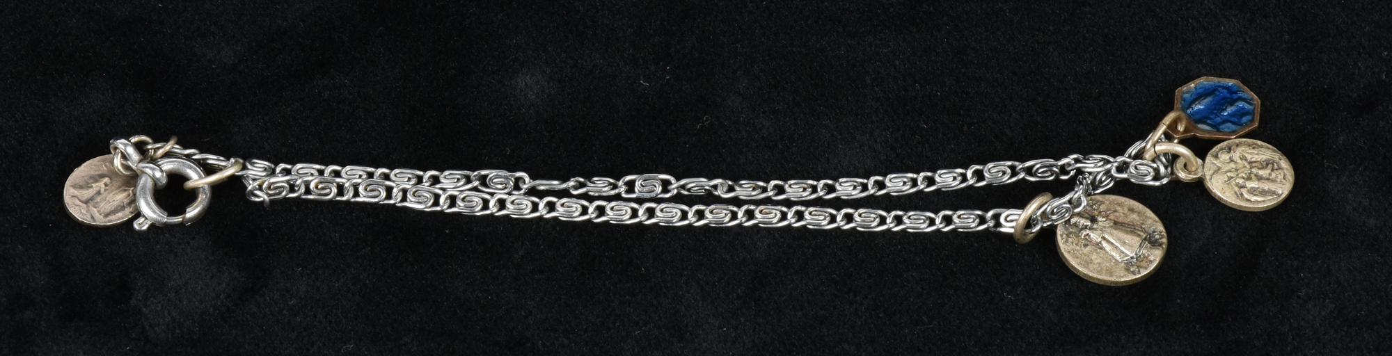 BRACCIALE IN METALLO ARGENTATO con quattro charms raffiguranti soggetti...