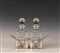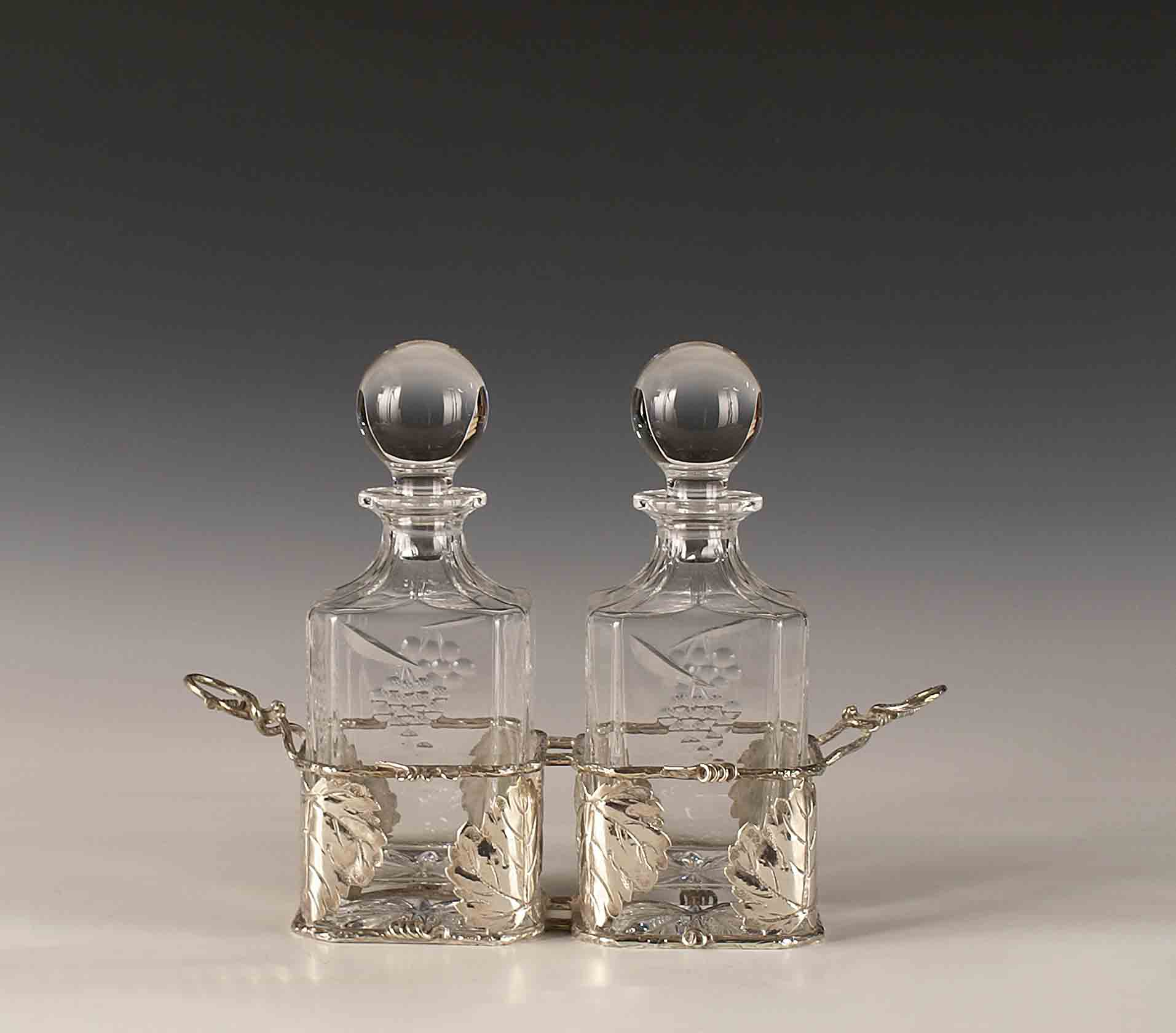 Coppia di bottiglie da liquore in cristallo molato entro portabottiglie in argento, gr. 500.