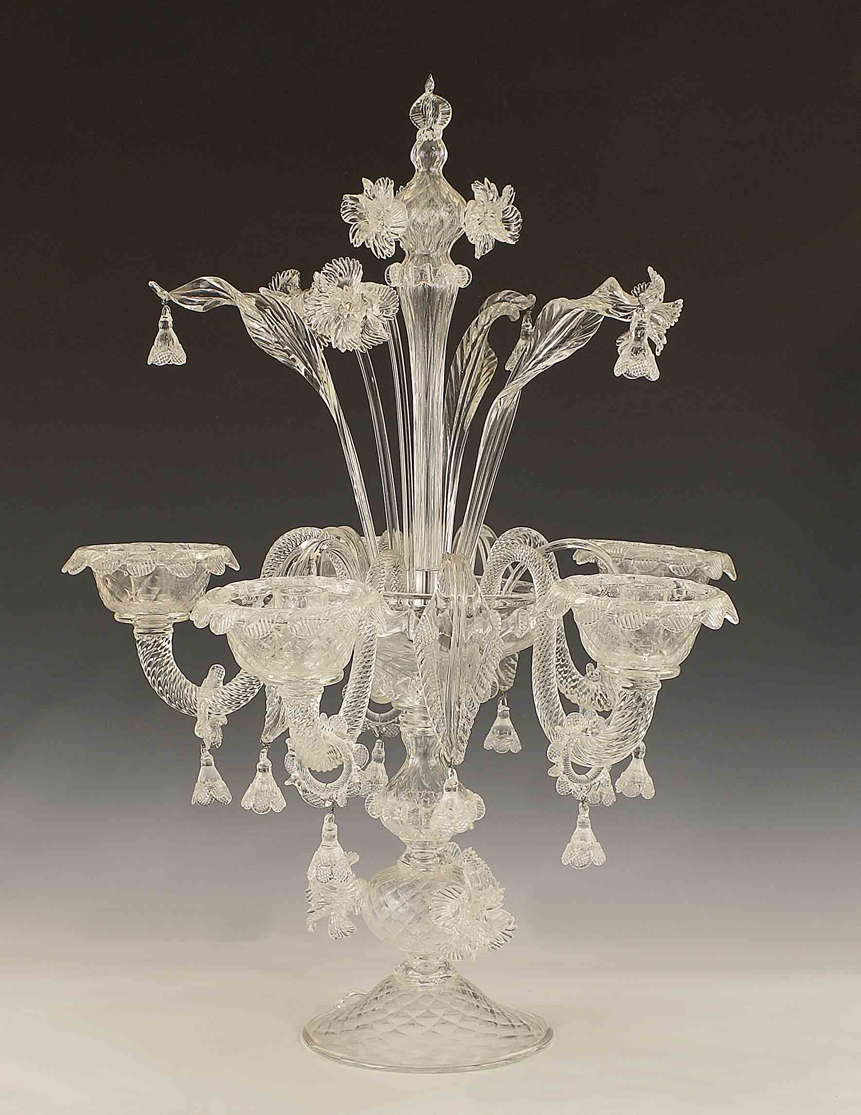 Particolare candelabro a cinque luci in vetro trasparente decorato a motivo floreale e vegetale, Murano, vecchia manifattura, h. cm. 70.