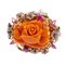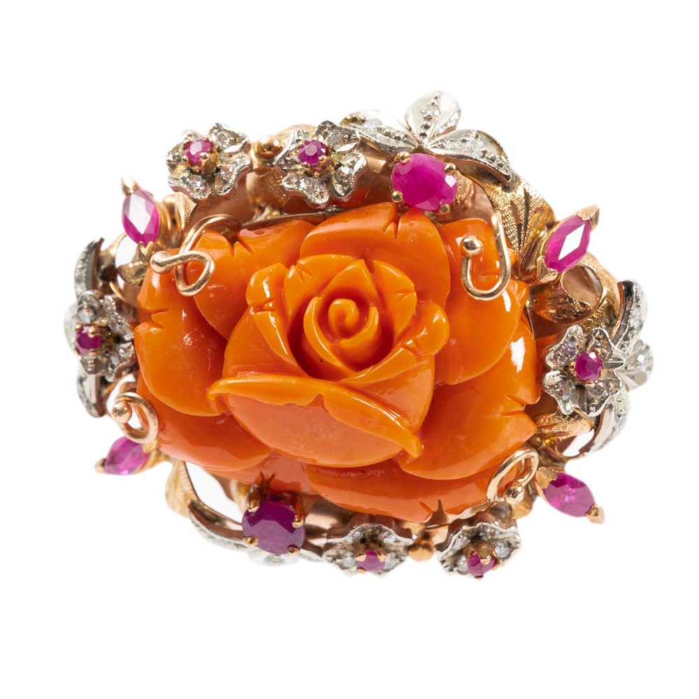 PENDENTE passante in oro 9 KT con diamanti taglio brillante ct. 0,25 peso di stima I color SI1 e rubini ct. 0,40 peso di stima e corallo inciso a guisa di rosa (g. 25,60).