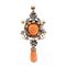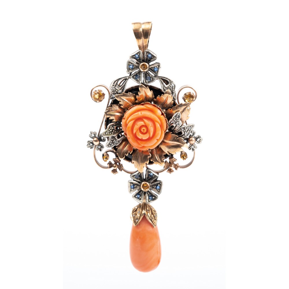 CIONDOLO in oro 9 KT e argento con diamanti ct. 0,06, zaffiri ct. 0,24, quarzi citrini, corallo centrale a forma di rosa e corallo a goccia (g. 38,30).