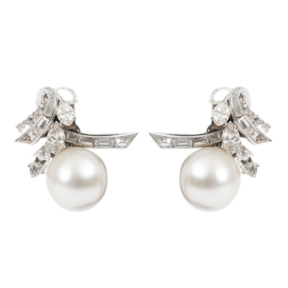 ORECCHINI in oro bianco 18 KT con perle coltivate Australia ct. 30,00 peso di stima, diamanti taglio spole ct. 1,00 peso di stima, diamanti taglio brillante ct. 0.40 peso di stima e diamanti taglio baguette ct. 1,30 peso di stima (g. 17,40).