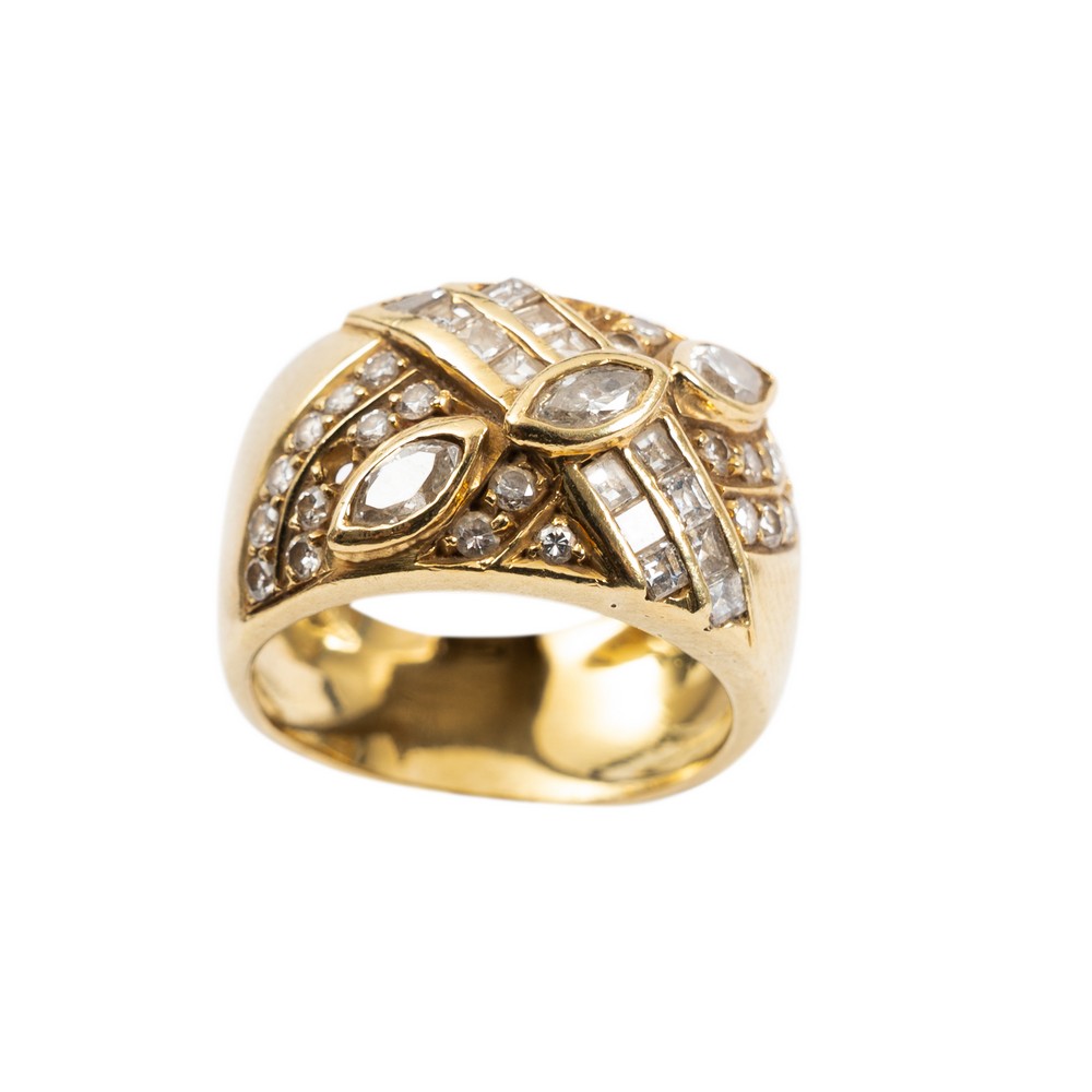ANELLO in oro giallo 18 KT con diamanti taglio brillante ct. 0,30 peso di stima, diamanti taglio spole ct. 0,20 peso di stima e diamanti taglio carrè ct. 0,28 peso di stima (g. 7,30) (due brillanti mancanti).