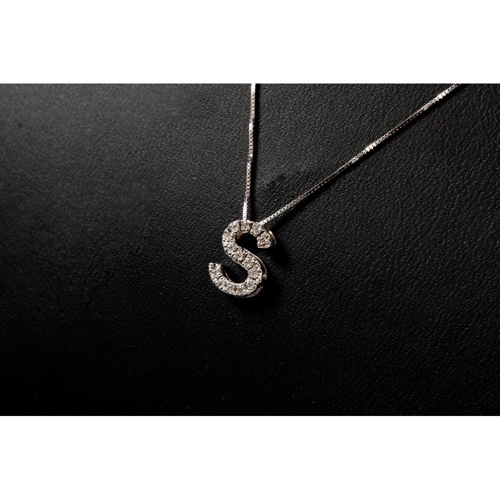 COLLANA in oro bianco 18 KT con pendente a forma di "S" con diamanti taglio brillante ct. 0,10 H color VVS 2 (g. 1,85).