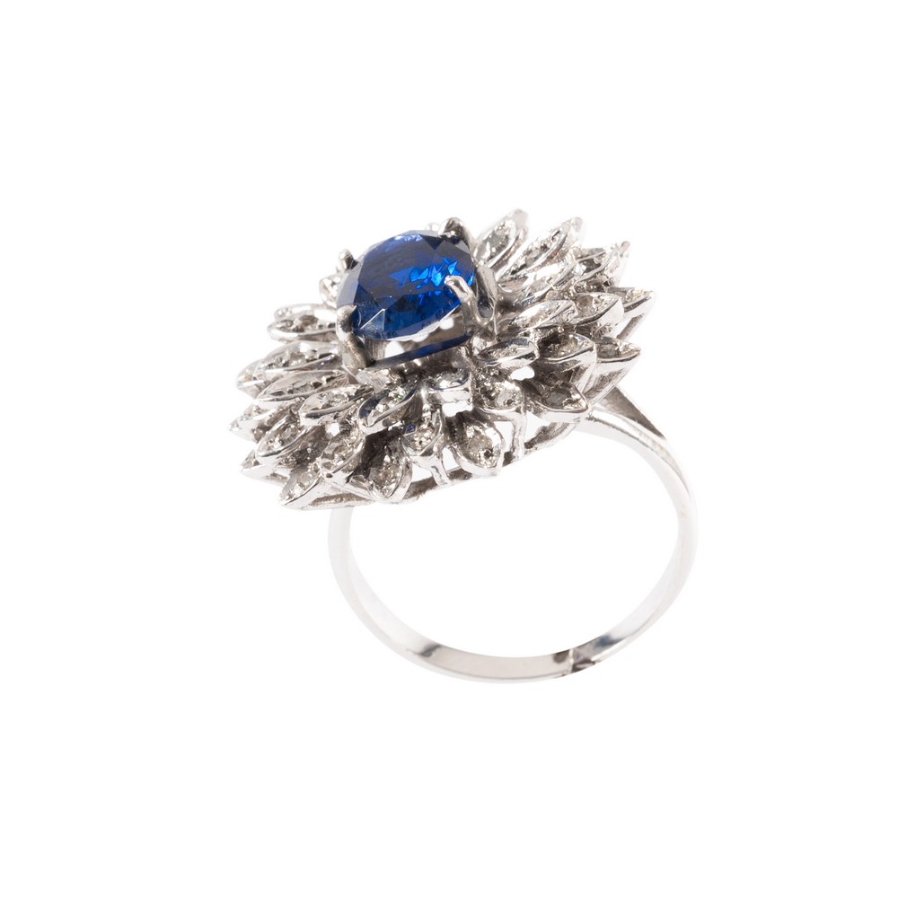 ANELLO in oro bianco 9 KT con diamanti ct. 0,50 e pietra di sintesi (g. 9,30).