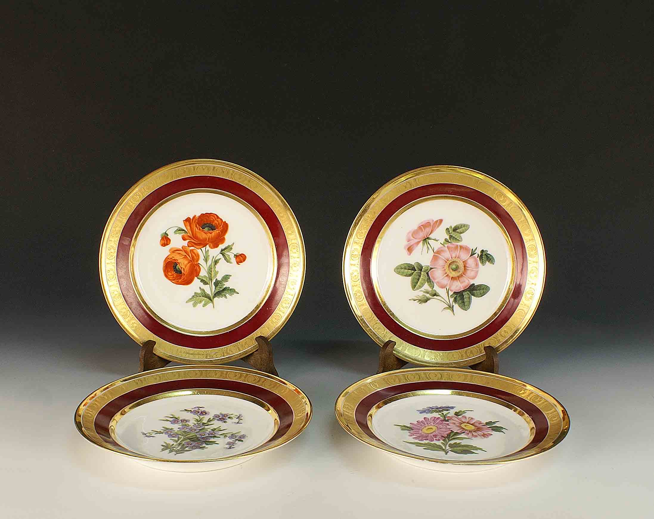 Quattro piatti in porcellana dipinta a policromia e parzialmente dorata, decorata a motivo floreale, Francia, XX secolo, d. cm. 22.