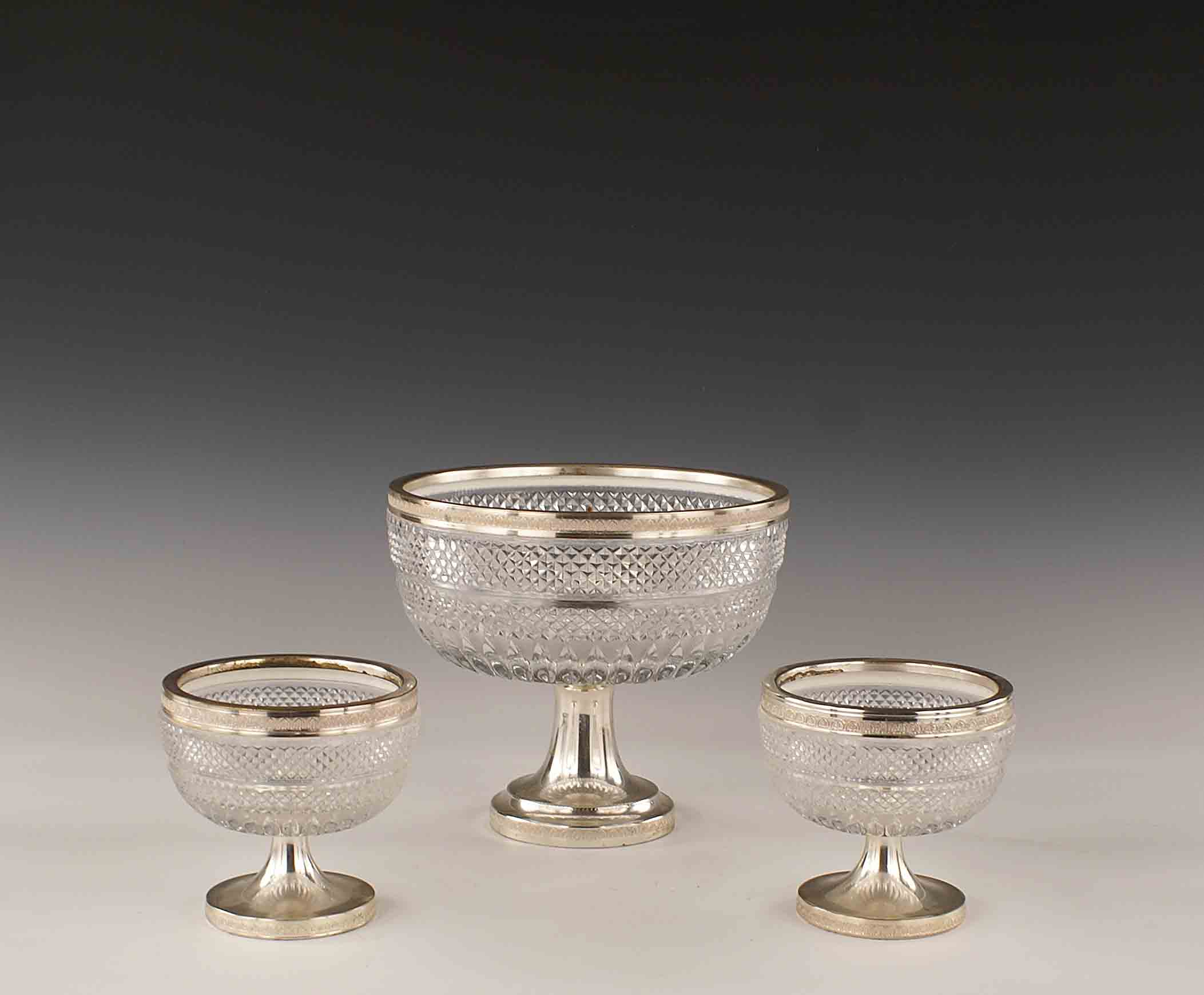 Lotto composto da una coppa ad alzata in cristallo molato e metallo e 2 relative coppette.