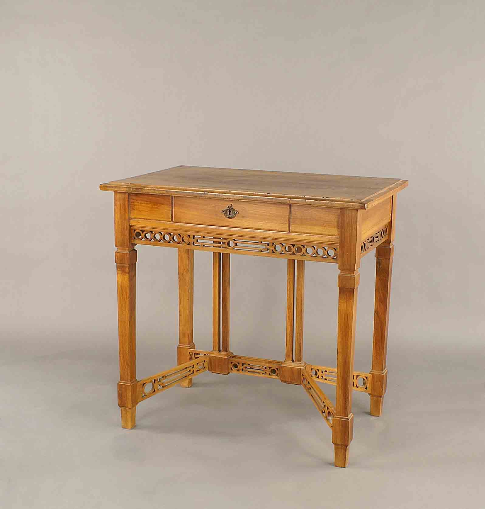 Tavolino in noce filettato, piano rettangolare poggiante su fascia centrata da un cassetto, gambe di linea squadrata riunite al centro, vecchia manifattura orientale, cm. 80x83x54.