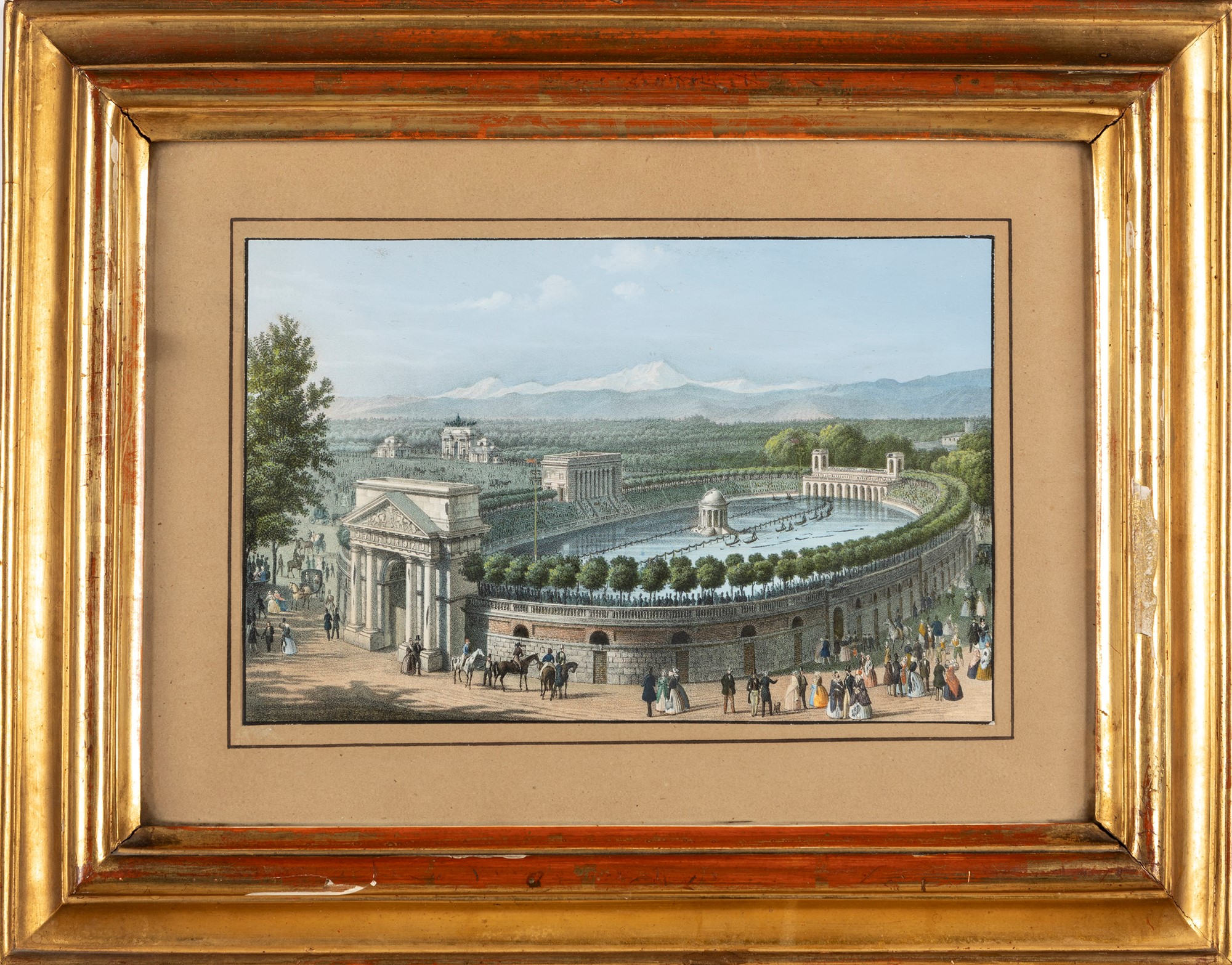 Stampa acquerellata a mano, su disegno di Federico Lose (Dresda 1776-Milano 1833), raffigurante l'Arena di Milano