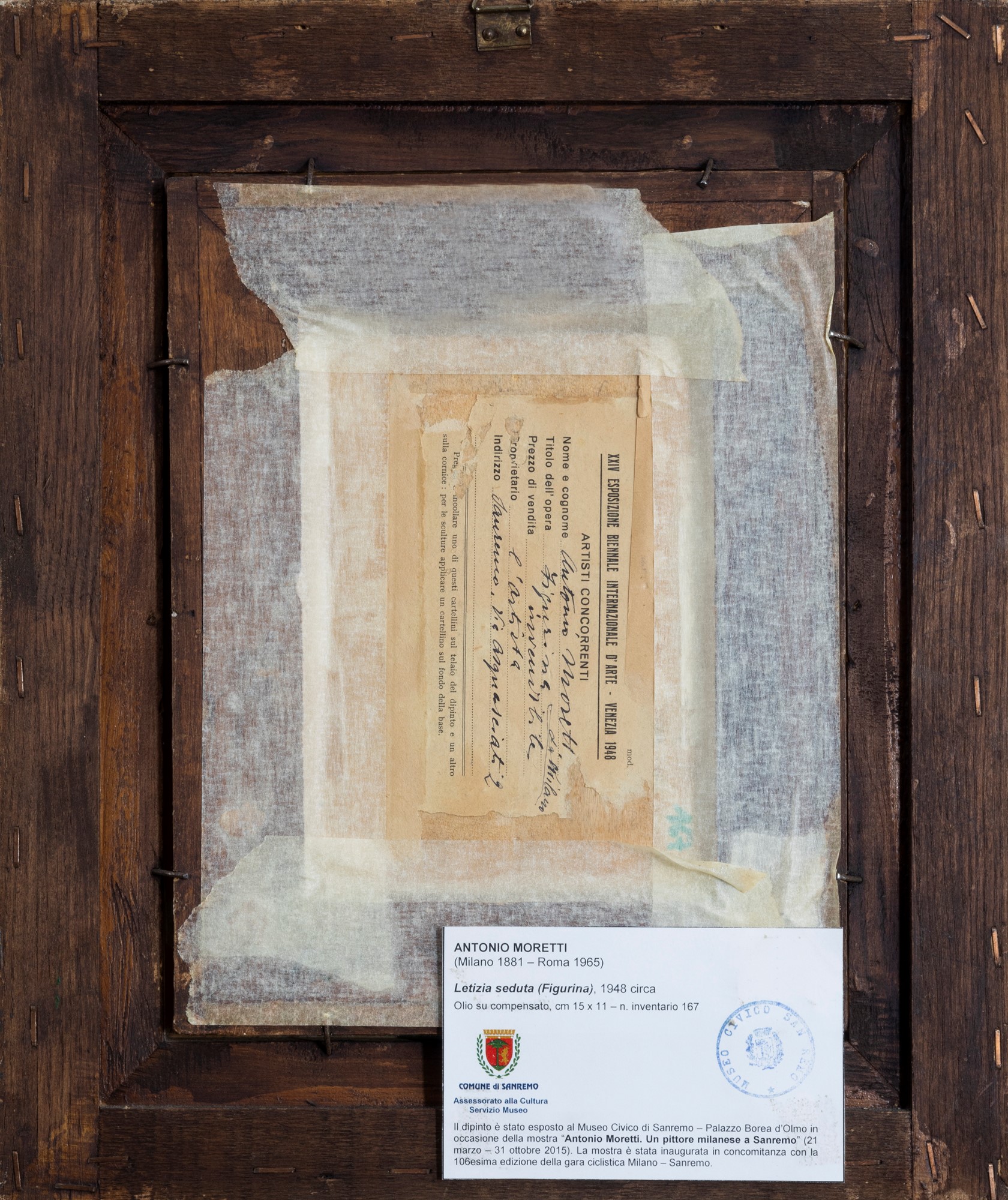 al retro cartellino della XXIV Esposizione Internazionale Biennale d'Arte - Venezia 1948 con riferimenti all'artista e all'opera e prezzo (invendibile); cartellino a stampa con riferimenti all'opera e timbro del Museo Civico di Sanremo in occasione della mostra Antonio Moretti. Un pittore milanese a Sanremo (21 marzo - 31 ottobre 2015).