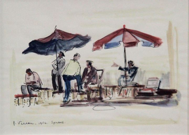 VELLAN FELICE Torino 1889 - 1976 "Ombrelloni a Spalato" 1964 27x37 acquerello...