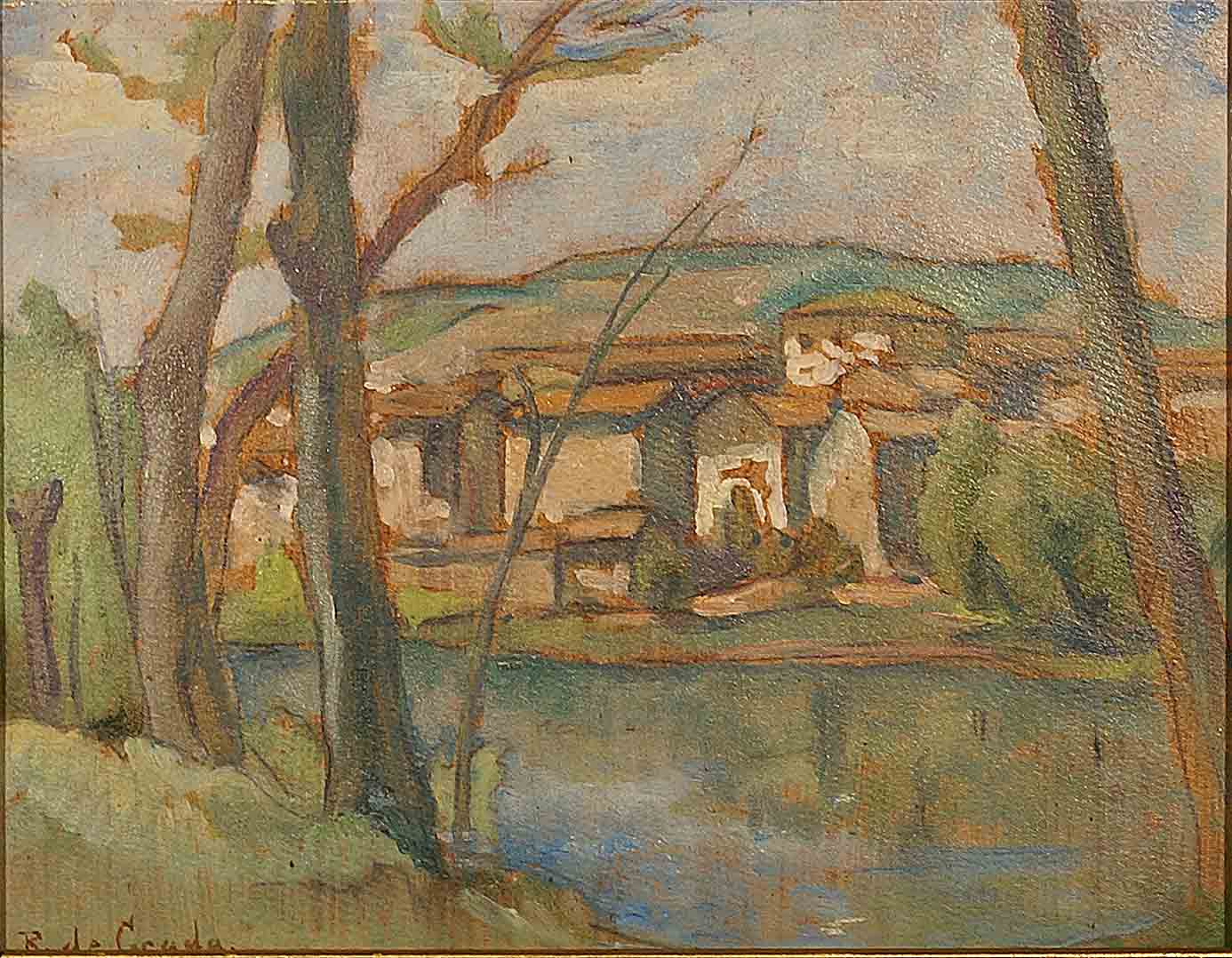 Raffaele De Grada (Milano 1885 - 1957), "Paesaggio a Carate Brianza", olio su cartoncino, cm. 22x28, firmato in basso a sinistra e sul retro datato 1950.