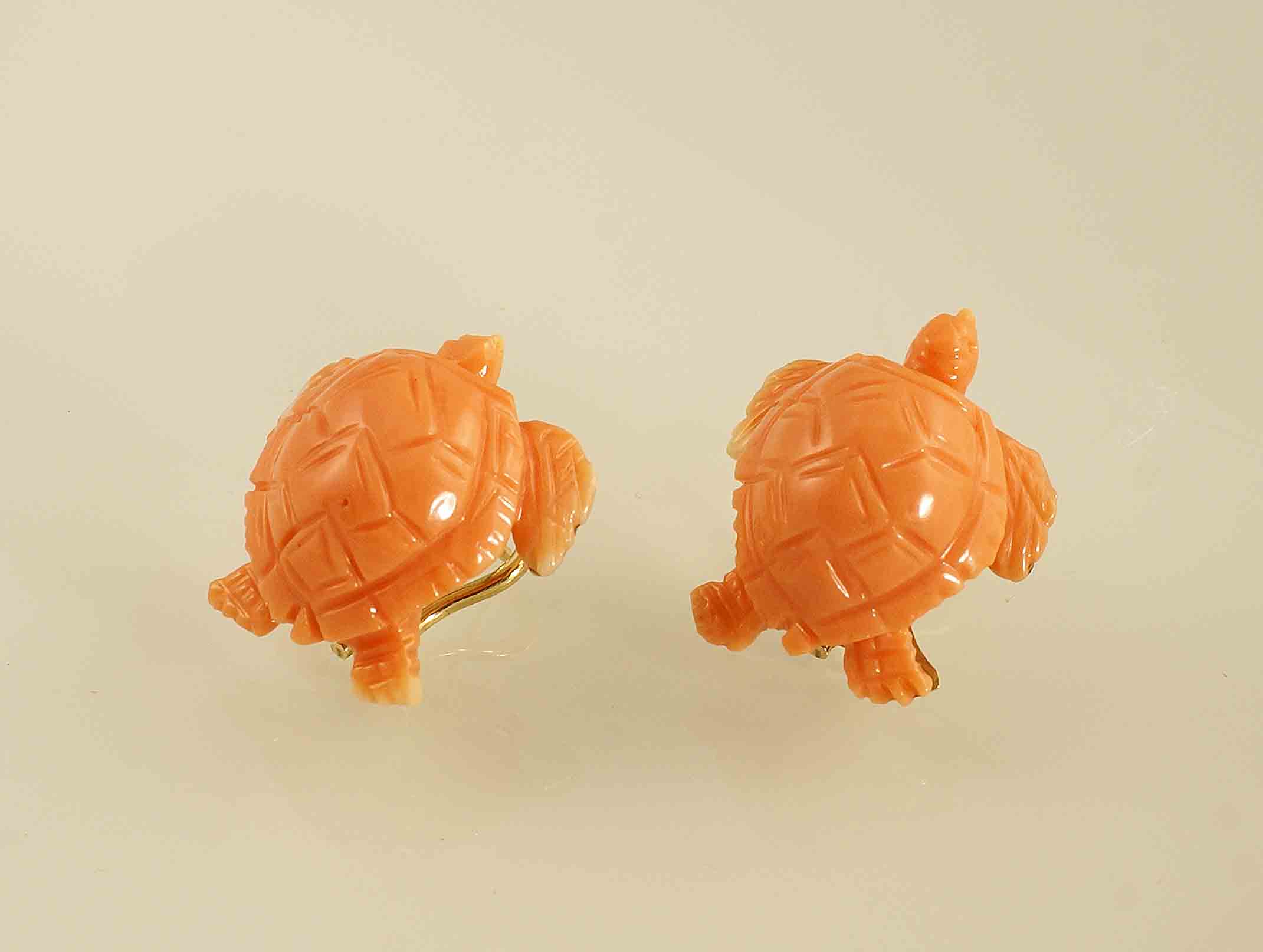 Orecchini in oro giallo 18kt con incastonate due tartarughe in corallo rosa, gr. 10,3.