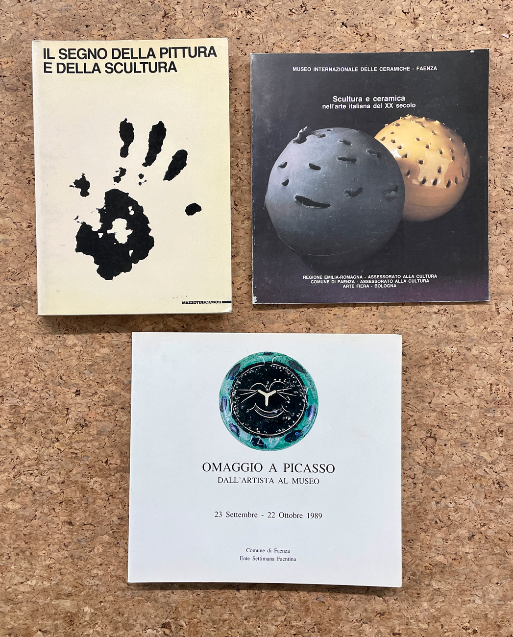 Catalogo riccamente illustrato, a cura di Gian Carlo Bojani, edito in occasione dell'esposizione tenutasi presso Palazzo delle Esposizioni, Faenza, 1989 (il catalogo raccoglie una rassegna di opere in ceramica dei principali artisti del XX secolo)