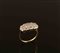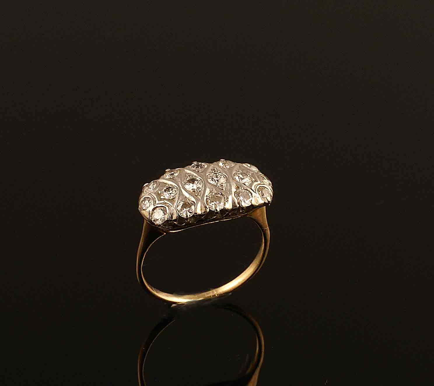 Anello in oro giallo e bianco 14kt con incastonati diamanti taglio brillante per 0,80 punti circa, anni 40/50, gr. 2,9.