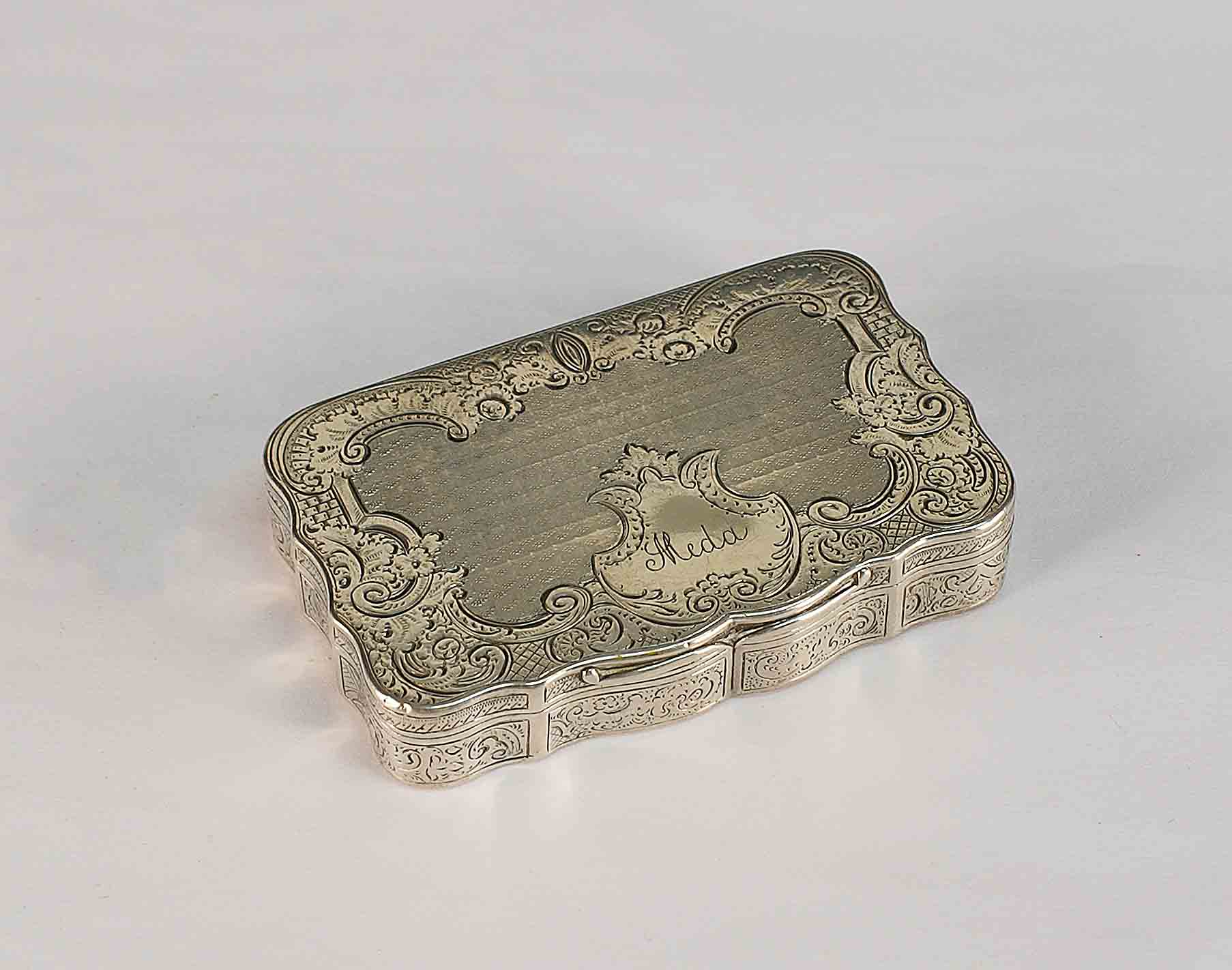 Tabacchiera in argento inciso a motivo floreale, XIX secolo, cm. 1,5x8,5x5,5, gr. 98.
