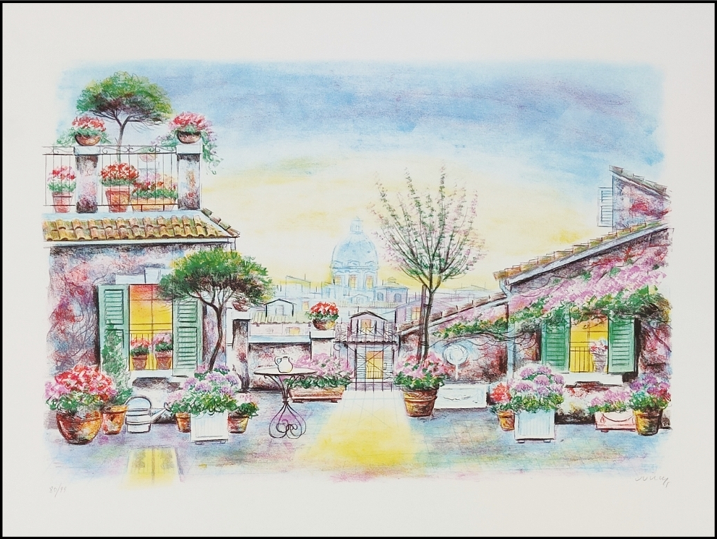 VULIC JOVAN Jugoslavia 1951 "Terrazza romana" Litografia su cartoncino cm 80x60. Firmata sul fronte in basso a destra, tiratura 80/99 in basso a sinistra. Sul retro etichetta di garanzia a cura dell'Istituto Grafico Italiano.