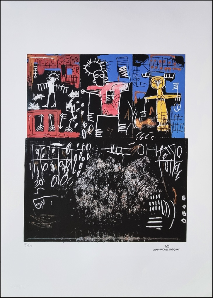 BASQUIAT JEAN-MICHEL New York 1960 - 1988 "Senza titolo" Riproduzione litografica offset cm 50x70. Firma in stampa sul fronte in basso a destra, tiratura 90/250 e timbro a secco a sinistra.