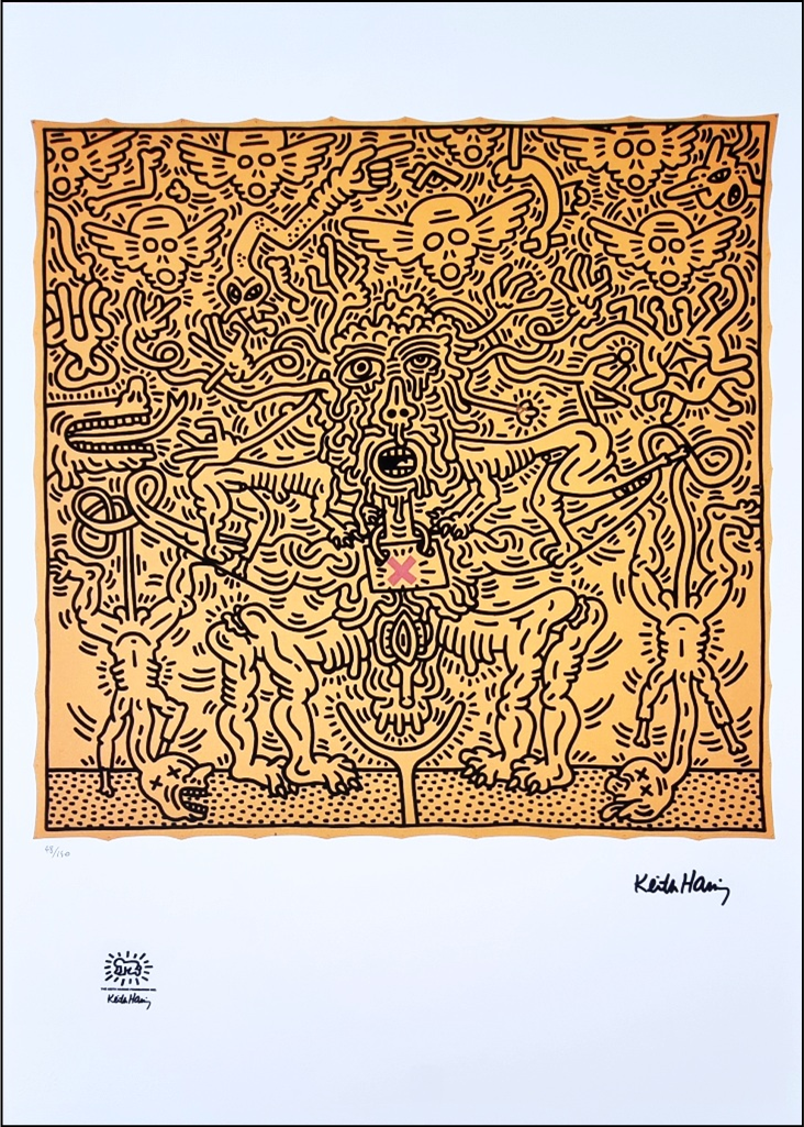 HARING KEITH Pennsylvania 1958 - New York 1990 "Senza titolo" Riproduzione litografica offset cm 50x70. Firma in stampa sul fronte in basso a destra, tiratura 48/150, timbro a secco e timbro in stampa a sinistra.
