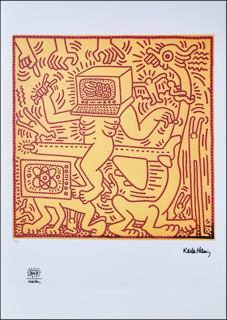 HARING KEITH Pennsylvania 1958 - New York 1990 "Senza titolo" Riproduzione litografica offset cm 50x70. Firma in stampa sul fronte in basso a destra, tiratura 26/150, timbro a secco e timbro in stampa a sinistra.