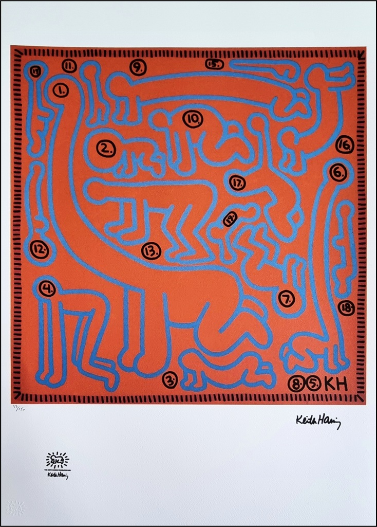 HARING KEITH Pennsylvania 1958 - New York 1990 "Senza titolo" Riproduzione litografica offset cm 50x70. Firma in stampa sul fronte in basso a destra, tiratura 33/150, timbro a secco e timbro in stampa a sinistra.