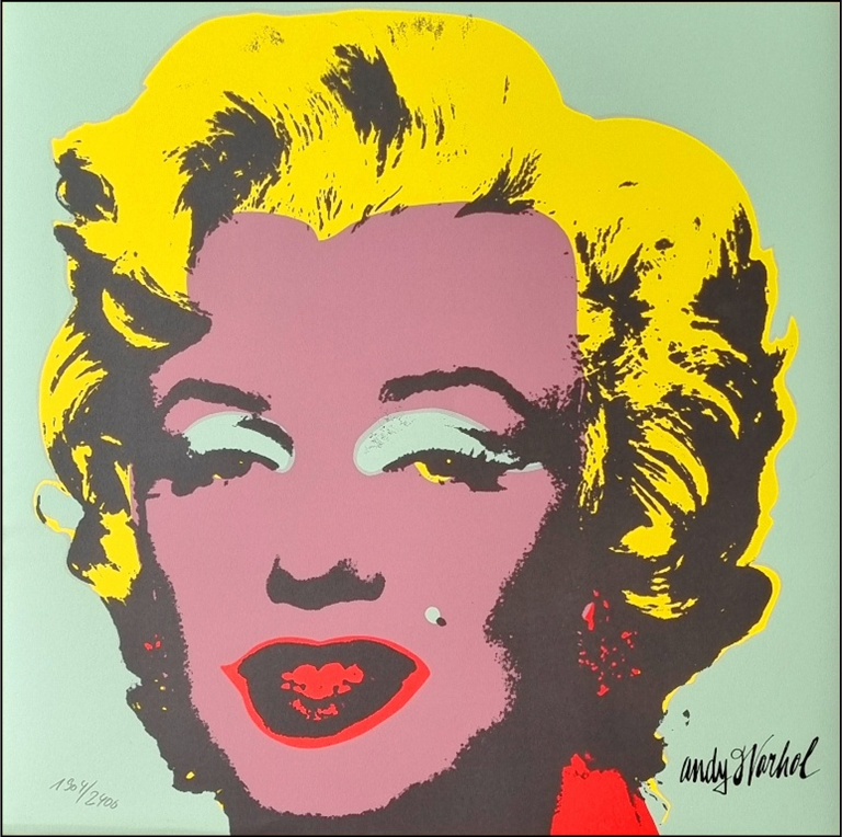 WARHOL ANDY Pittsburgh 1928 - New York 1987 "Marilyn" Riproduzione litografica offset su cartoncino cm 60x60. Firmata in stampa sul fronte in basso a destra, tiratura a matita 1904/2400 in basso a sinistra. Sul retro timbro Edizioni CMOA e ologramma.