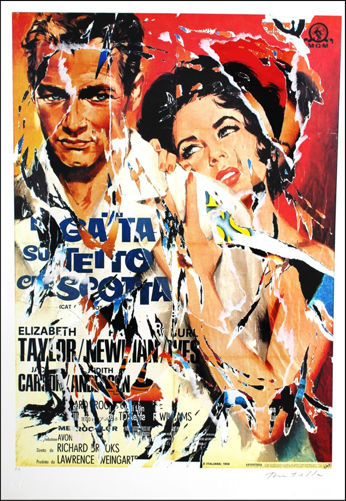 ROTELLA MIMMO Catanzaro 1918 - Milano 2006 "La gatta sul tetto che scotta" Multiplo decollage, strappi di manifesto applicati su supporto serigrafico su cartoncino, cm 70x100. Firmato sul fronte in basso a destra, tiratura P.A. e timbro a secco "Fondazione Rotella" in basso a sinistra. Opera pubblicata sul catalogo "Mimmo Rotella multiplo decollage", Silvana Editore, a pagg. 78 e 79.