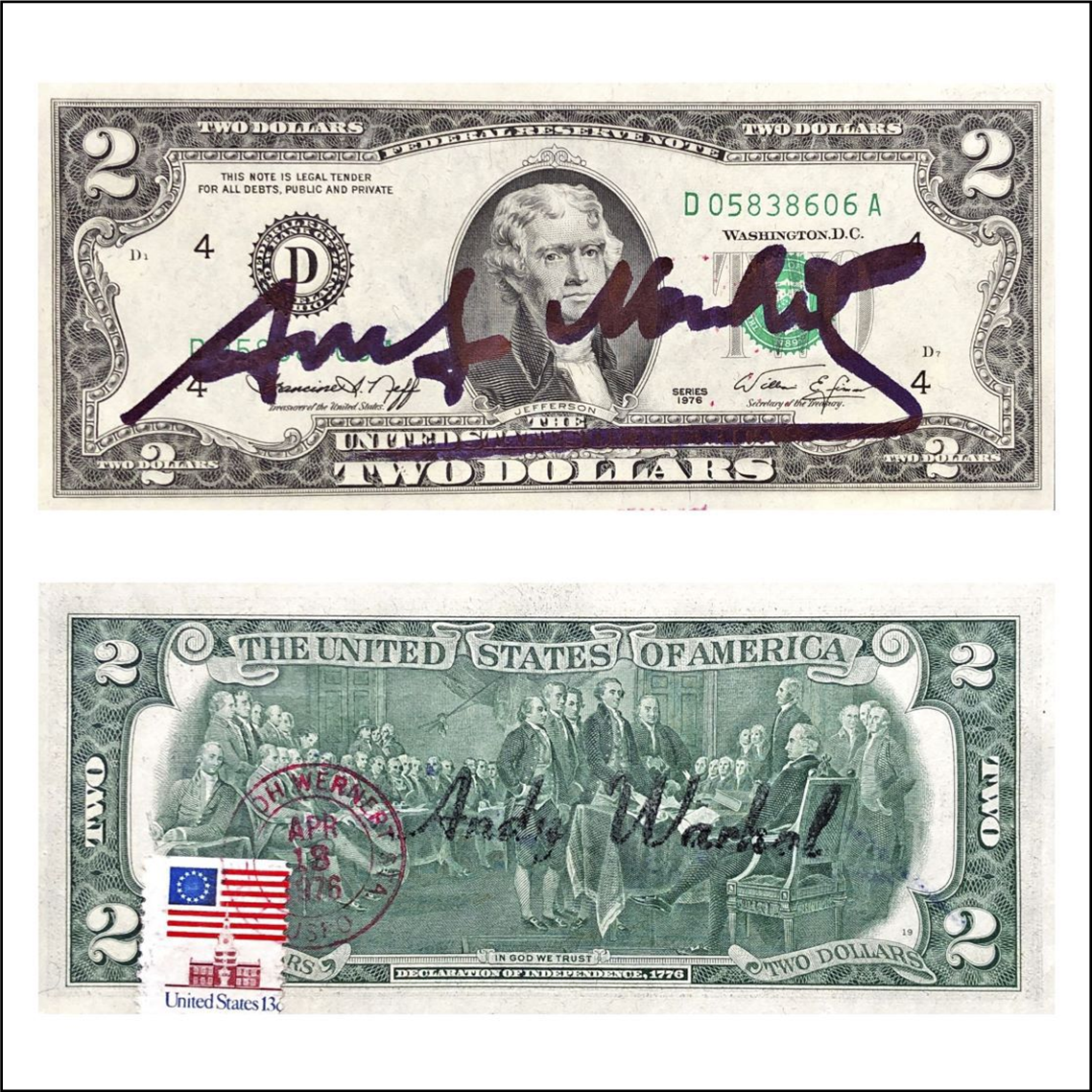 WARHOL ANDY Pittsburgh 1928 - New York 1987 "2 Dollars - D05838606A" Banconota da 2 dollari recante sul fronte firma autografa dell'artista. Sul retro francobollo e timbro postale USA del 13 aprile 1976, oltre timbro della "Factory Warhol". Dimensioni mm 155,955x66,294 come riportate su certificato di autenticità ed unicità dell'esemplare, emesso da GALERIE 32 - Nizza. Opera contenuta in espositore in plexiglass.