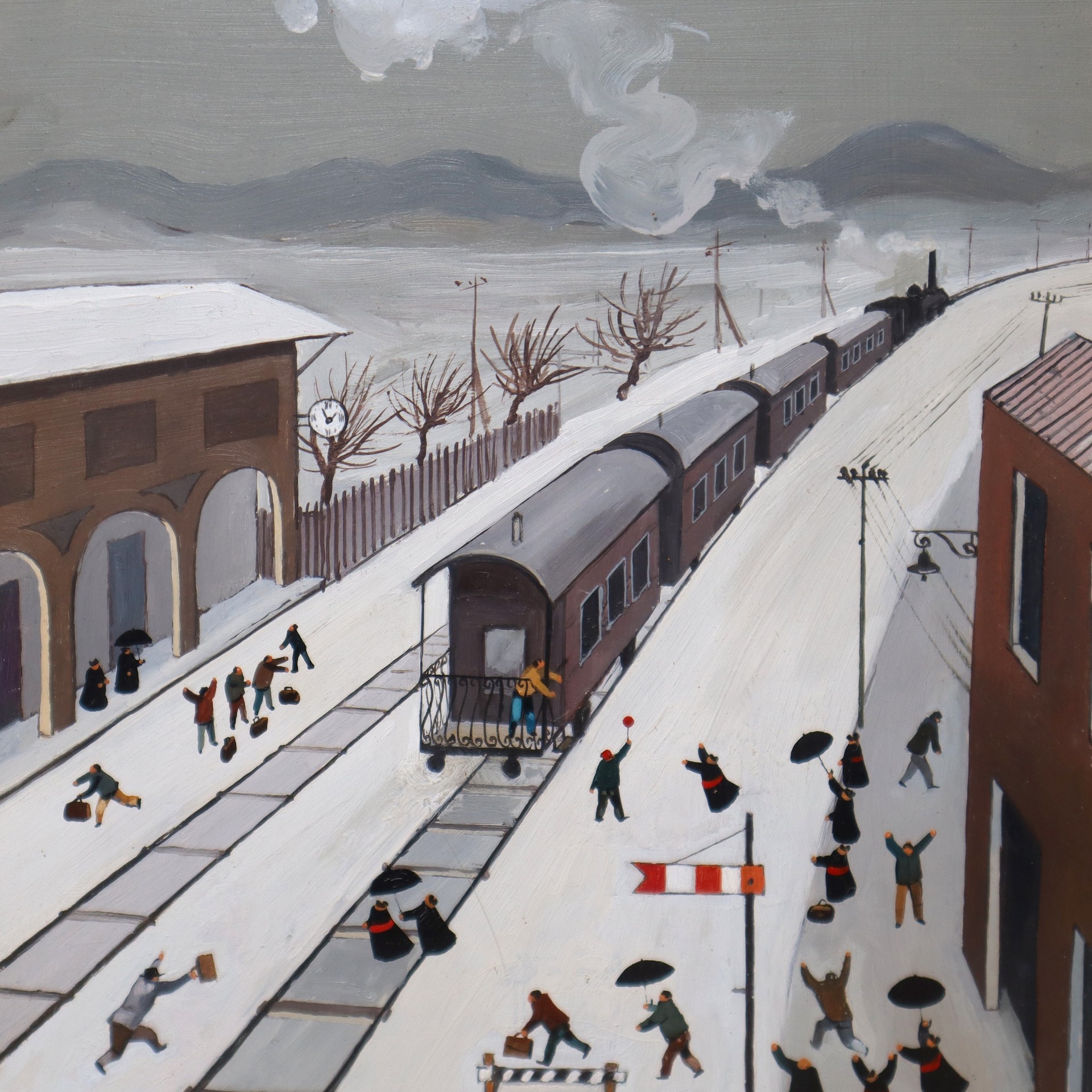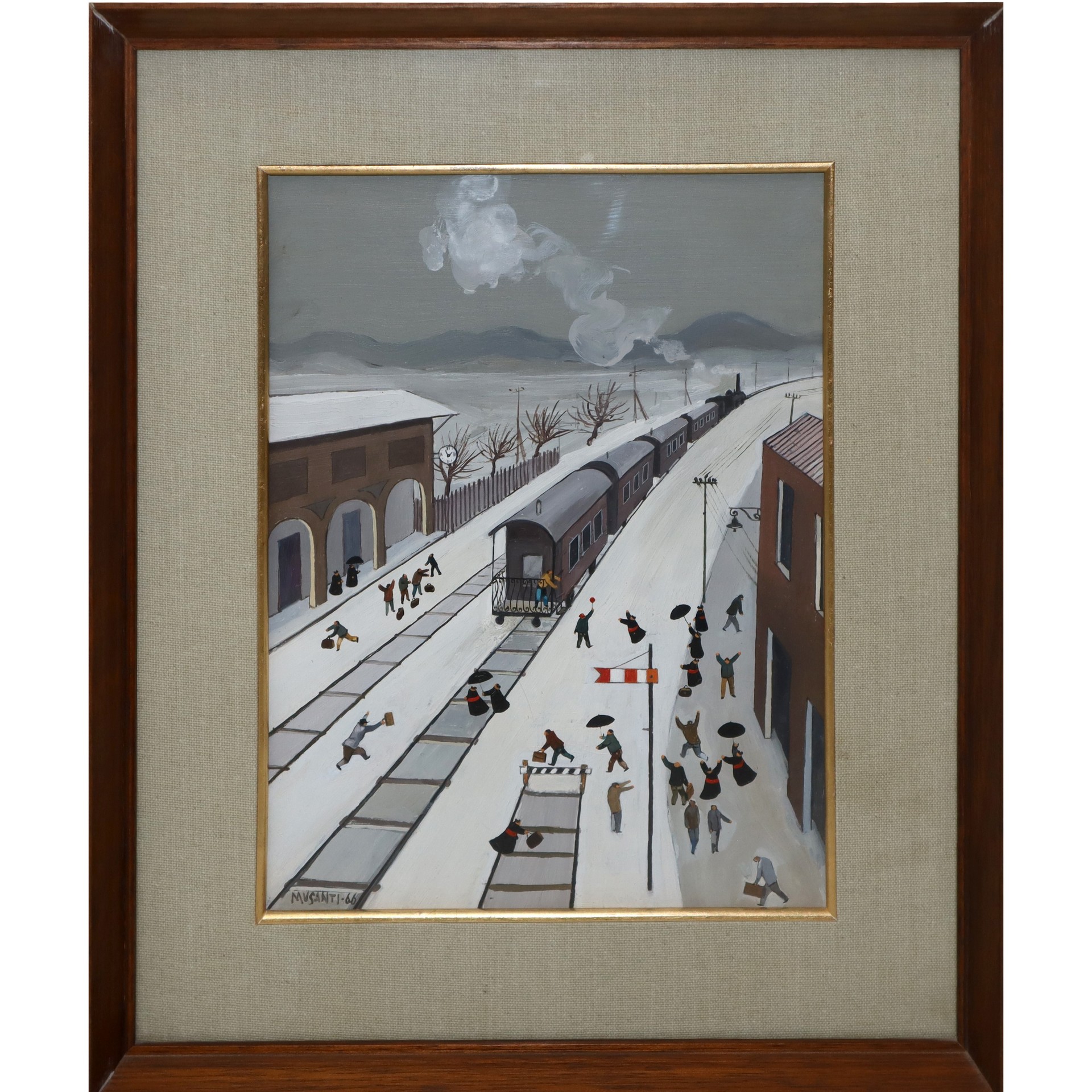 Marco Musanti - Stazione innevata, 1966 cm 30, 5x23 in cornice 44x37 Olio su masonite Firmato in basso a destra e datato 66
