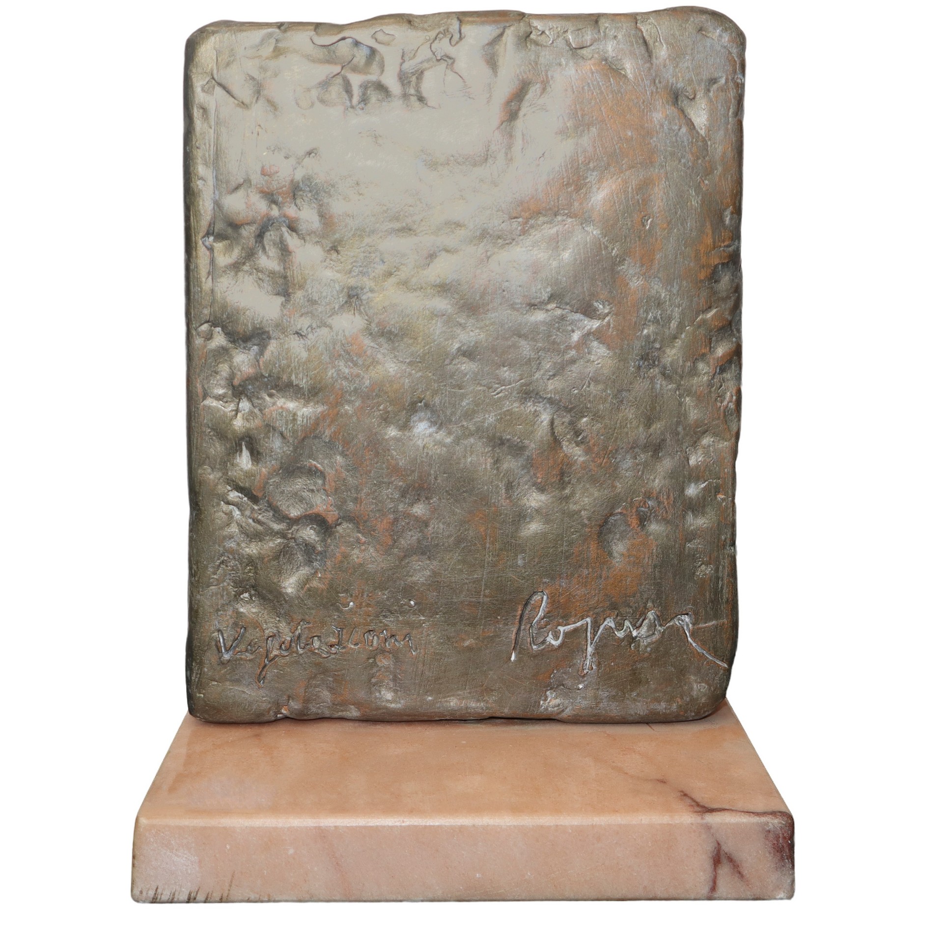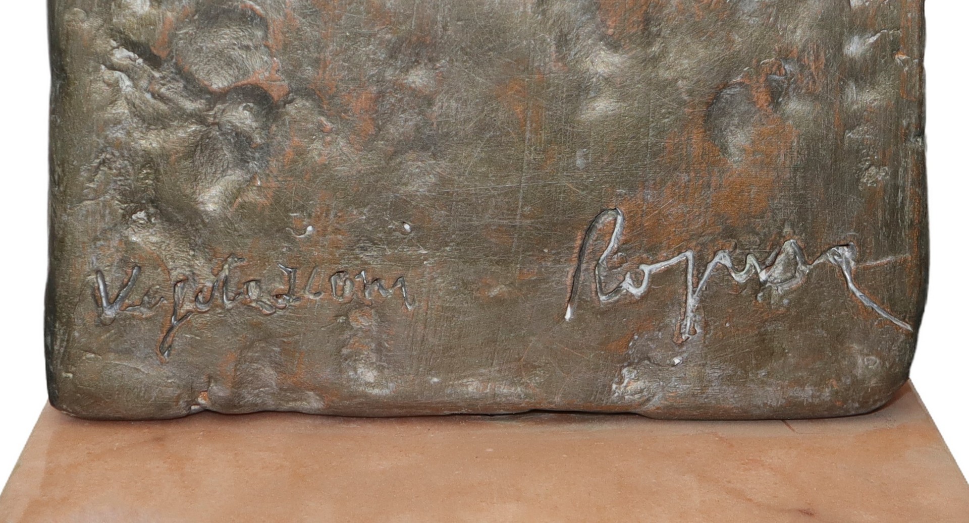 Terracotta patinata e base in marmo rosa. Firmata e titolata sul retro. Opera unica