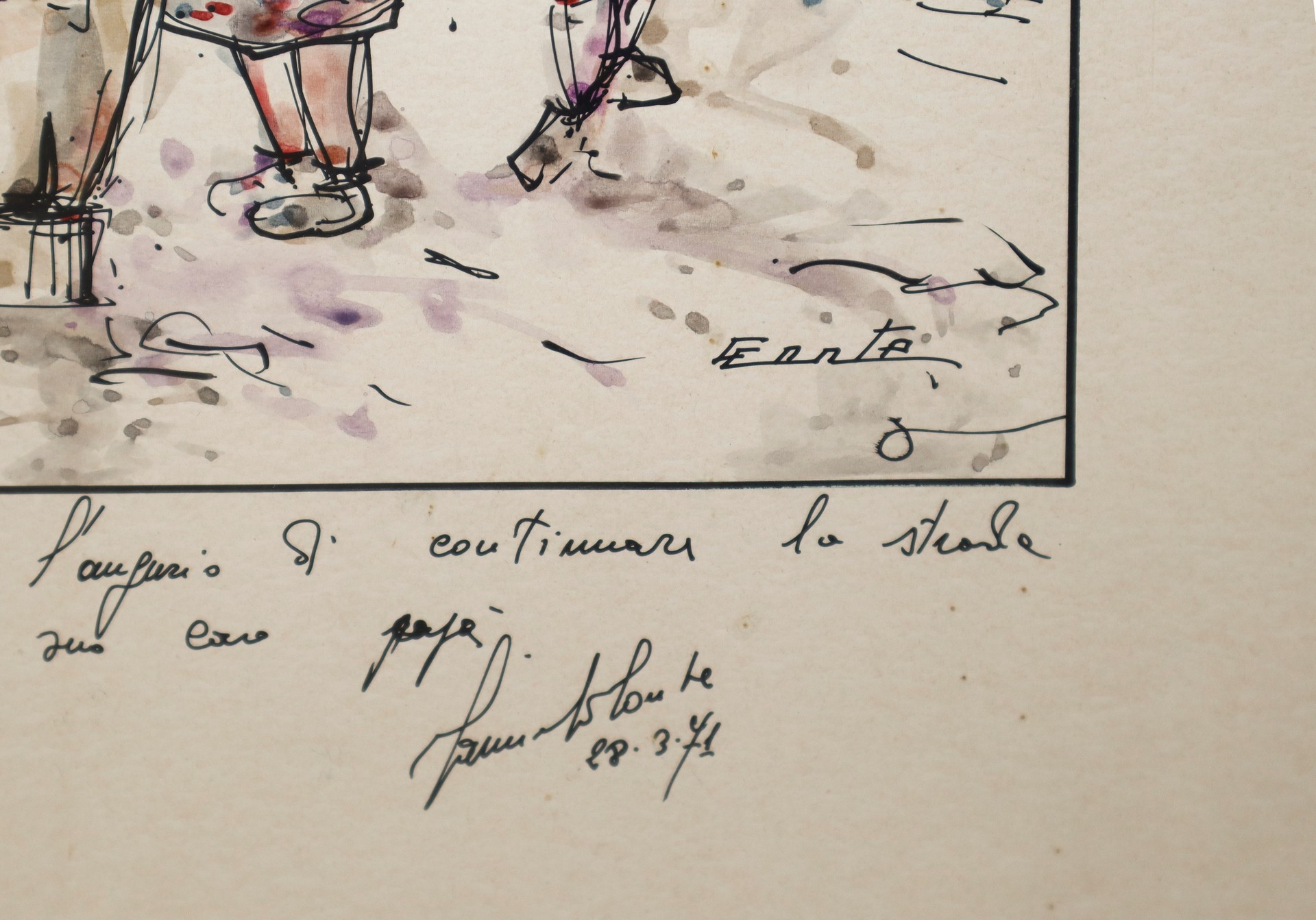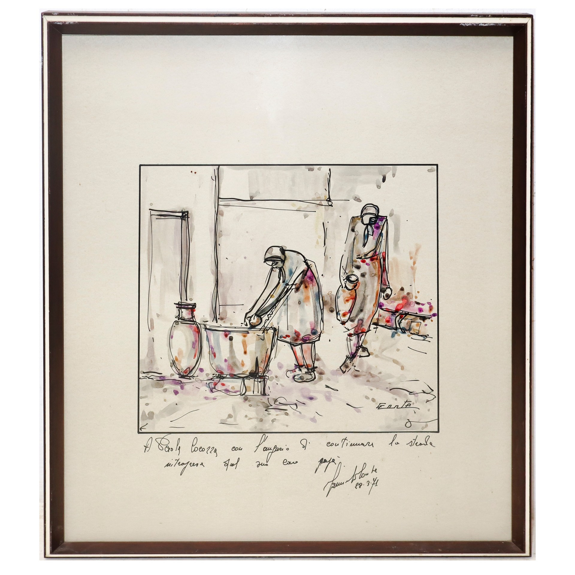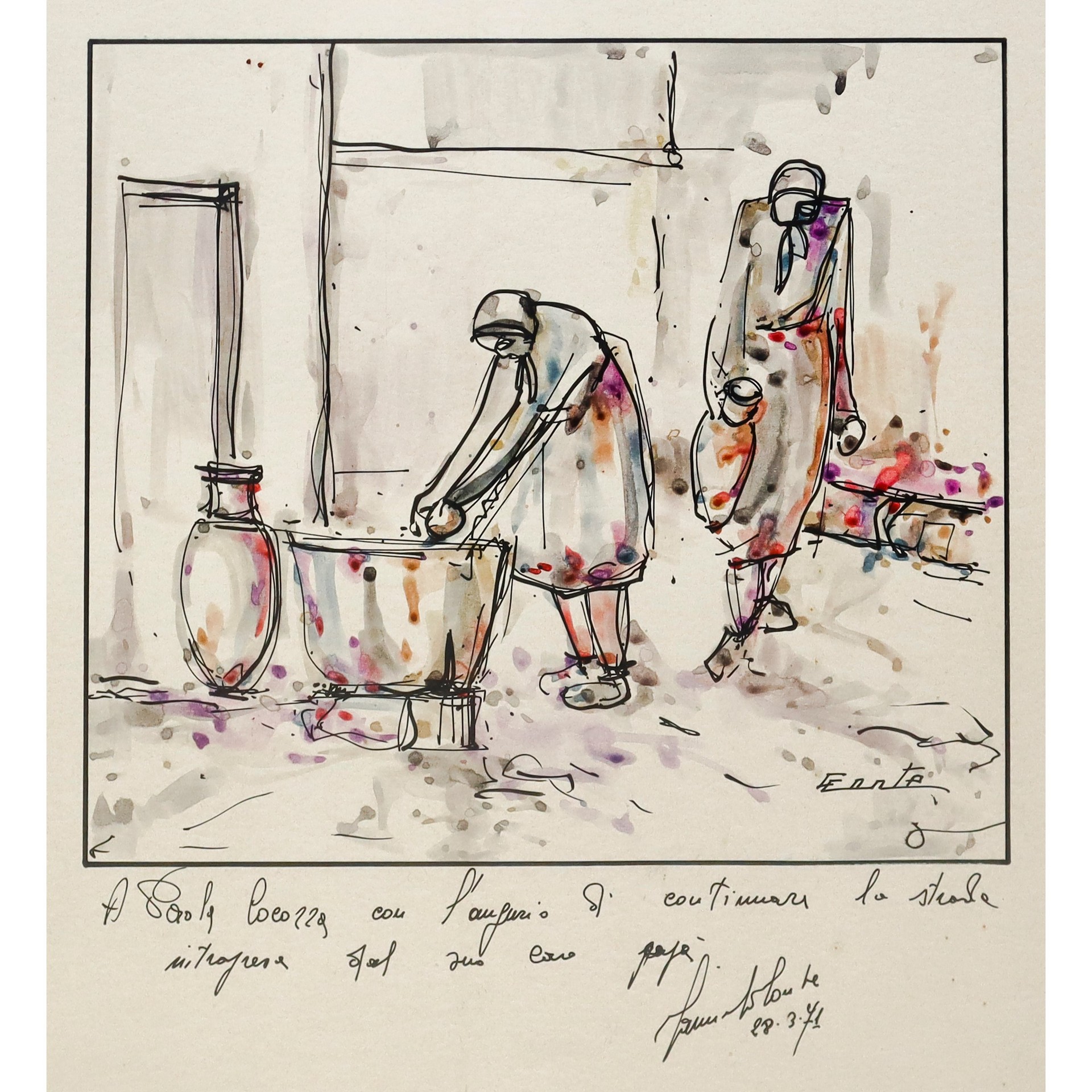 Carmelo Conte (Latiano 1946) - Le lavandaie, 1971 Cm 39 x 35 , in cornice 42 x 37 Tecica mista su carta Firma e dedica sul fronte