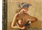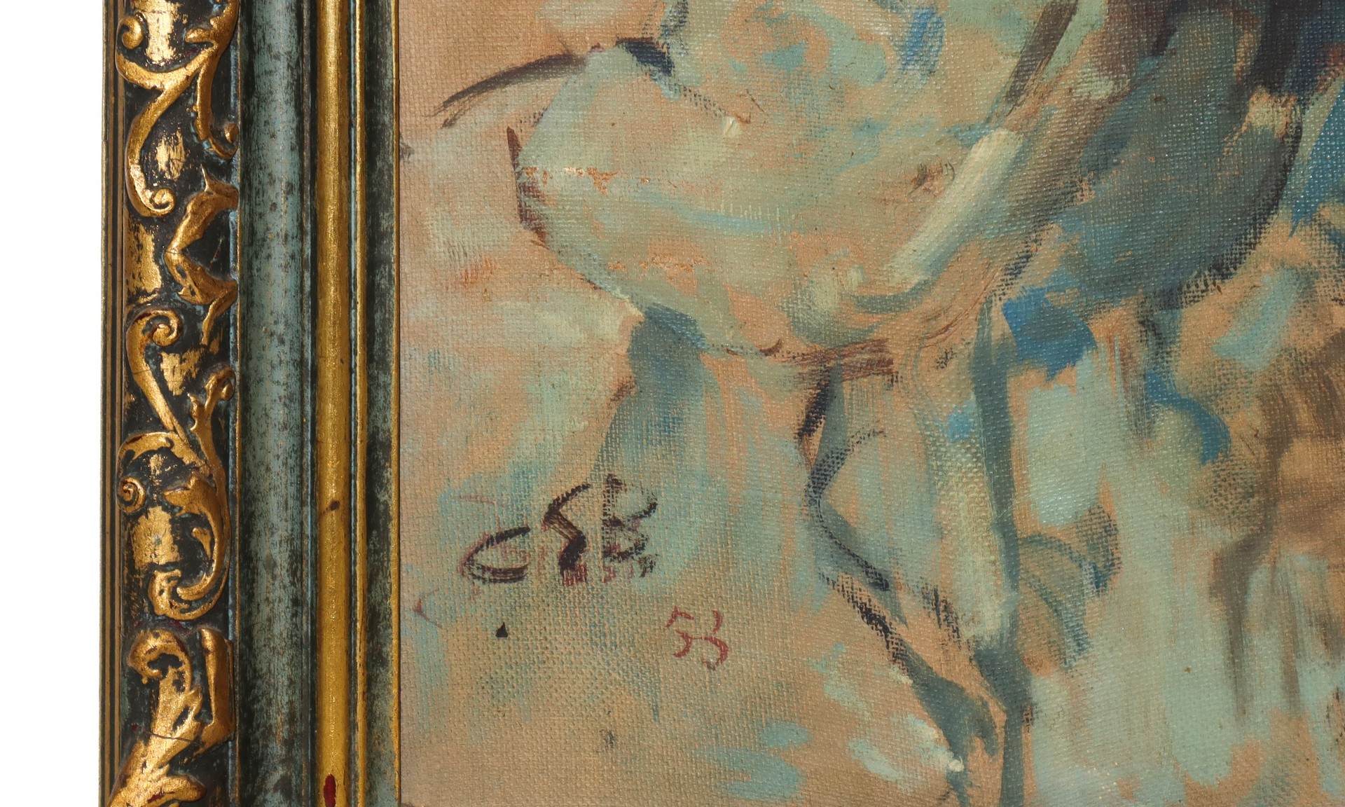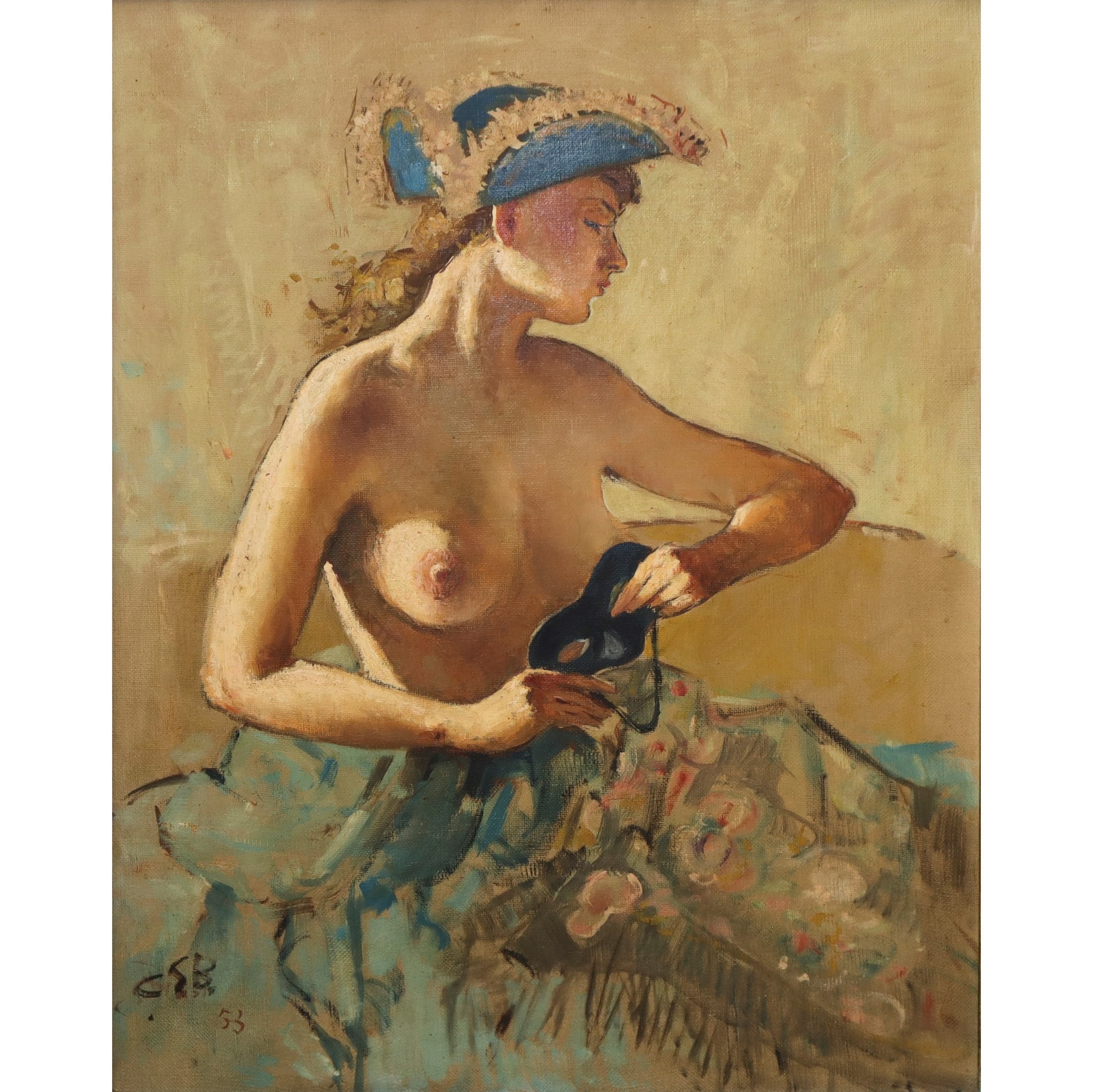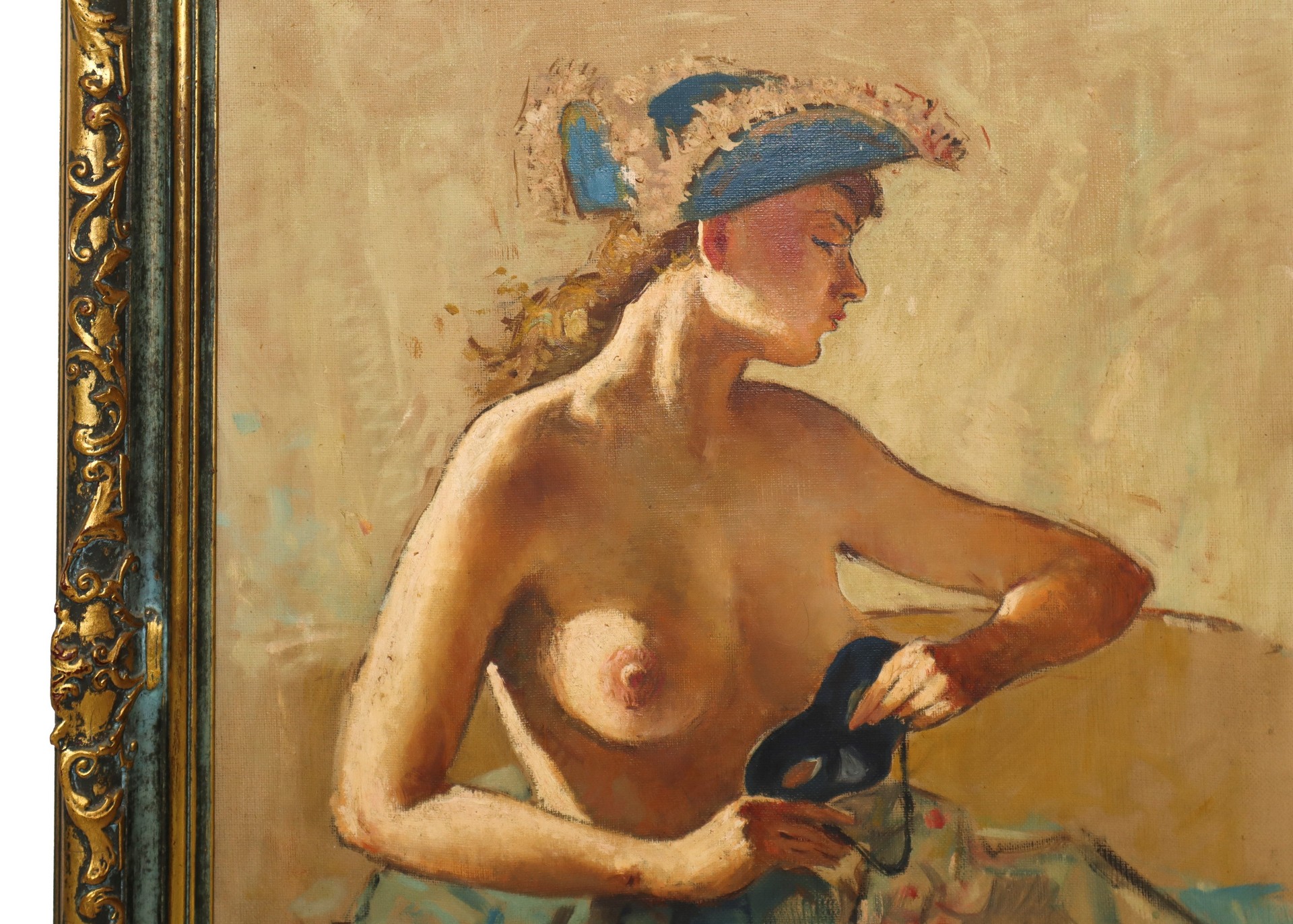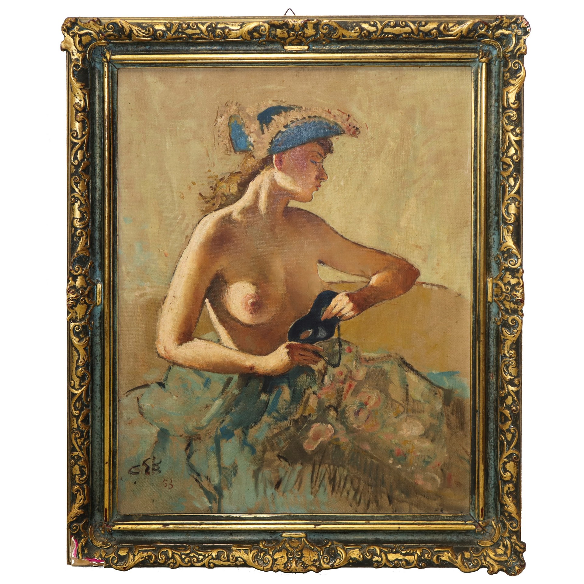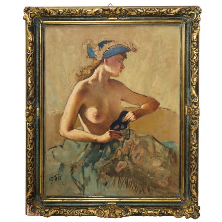 Nudo di donna con cappello settecentesco e maschera cm 50X40 in cornice cm 60X50 Olio su tela Datato 53 in basso a destra, firmato con monogramma CSB