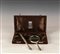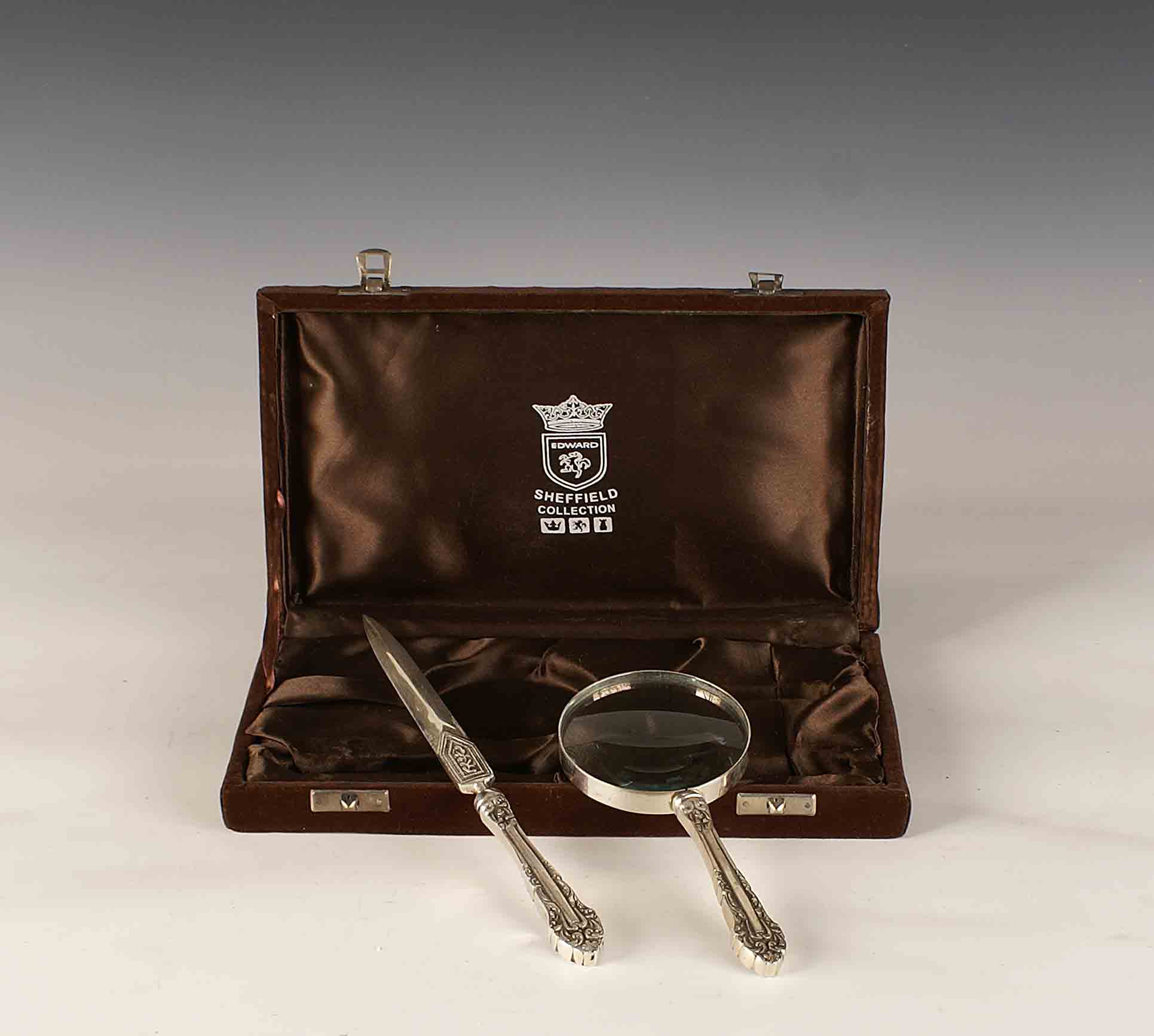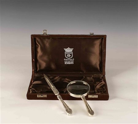 Set da scrittoio in sheffield composto da una lente e un tagliacarte entro custodia.