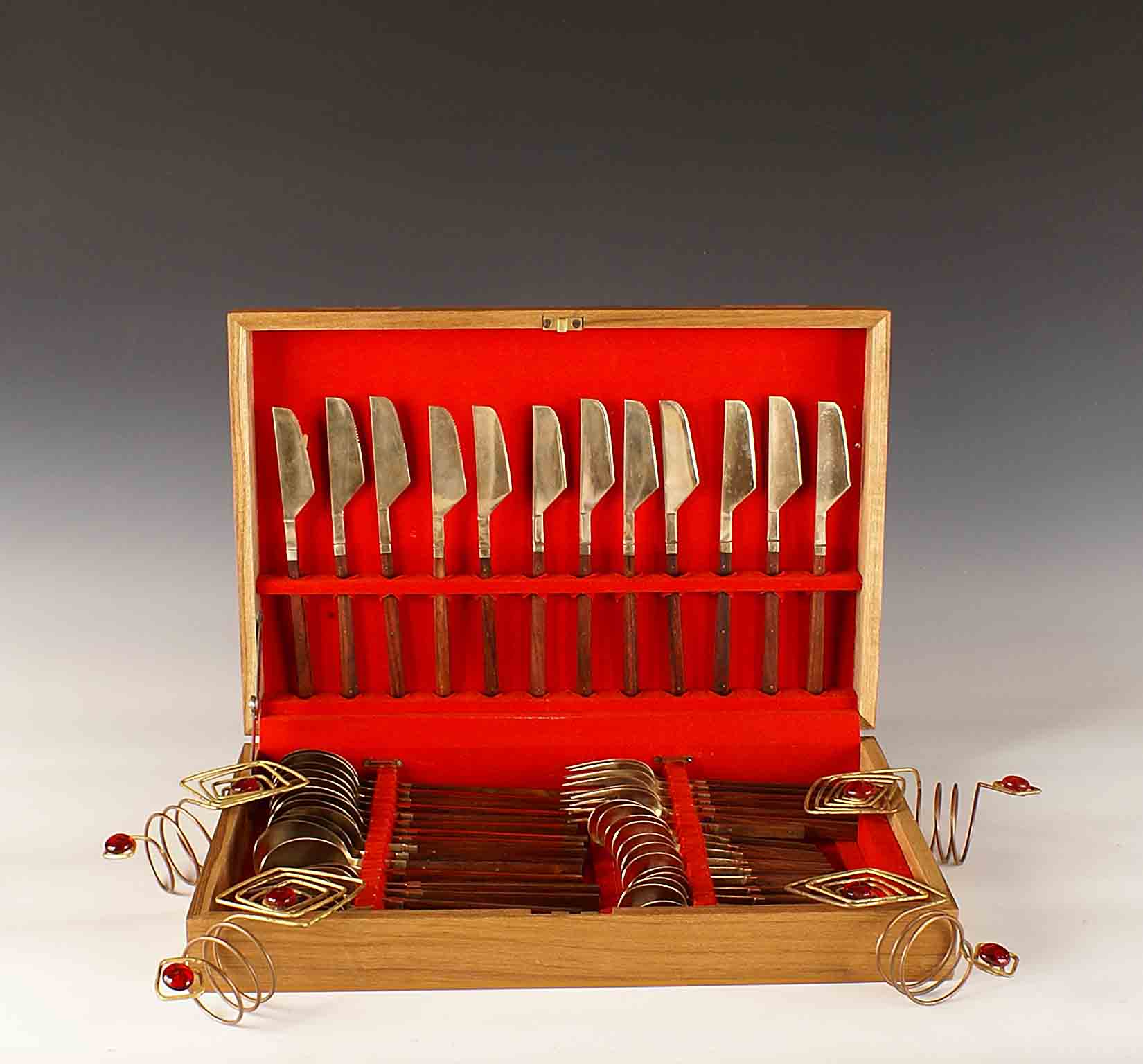 Lotto composto da un servizio di posate di 48 pezzi in legno e metallo dorato...