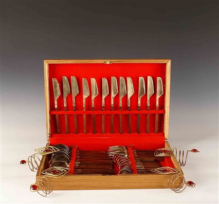 Lotto composto da un servizio di posate di 48 pezzi in legno e metallo dorato e 4 portatovaglioli in metallo.