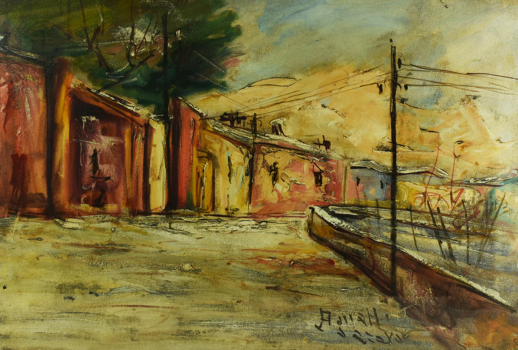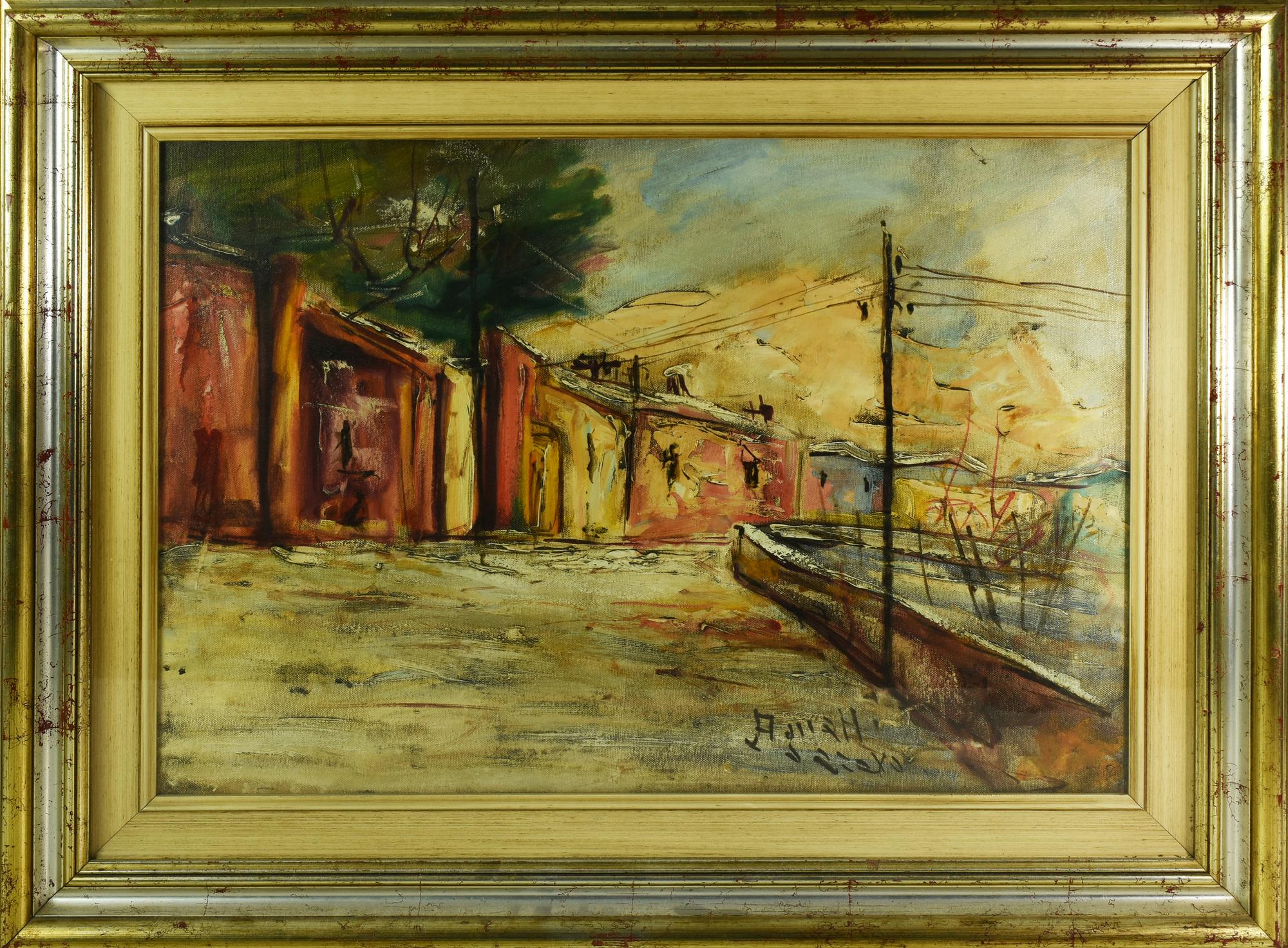 Piero Agnetti STRADA DI PAESE olio su tela, cm 50x70 firma sul retro: timbro...