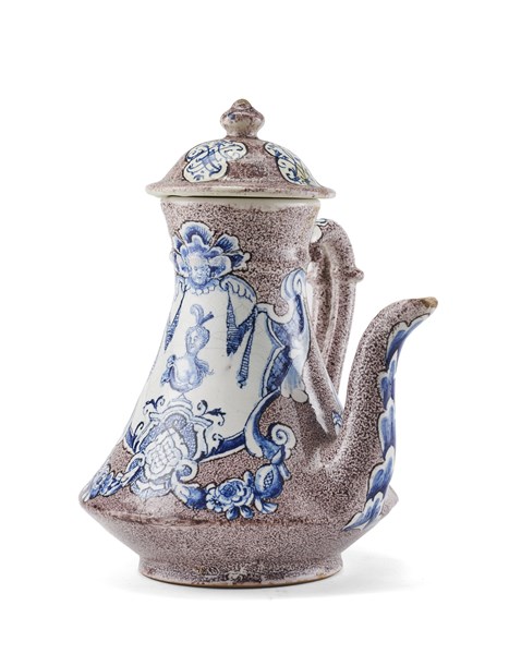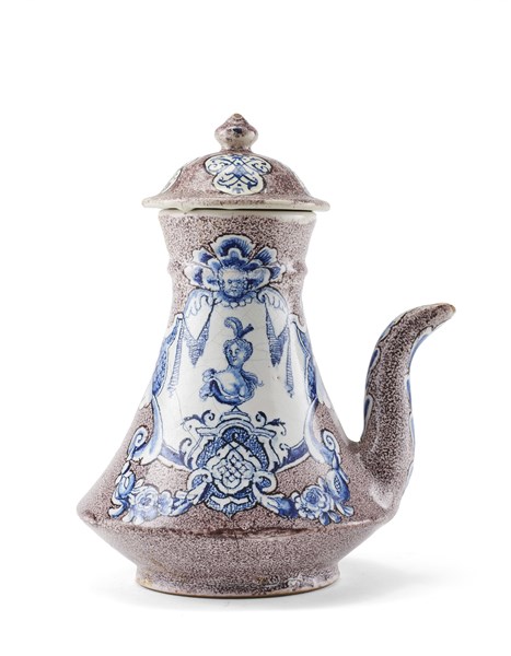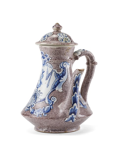 Manifattura di Ferniani, Faenza, XVIII secolo. Cioccolatiera con coperchio in maiolica, corpo con decoro in blu alla "Berain" centrato da busto femminile tra panneggi entro riserve di foglie e fiori su fondo spugnato manganese (h. cm 21) (felature e sbeccature, coperchio restaurato)