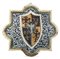 Manifattura del secolo XV - XVI, probabilmente Ferrara. Targa in maiolica a profilo mistilineo decorata in policromia con stemma araldico dei duchi d'Este su fondo di racemi accartocciati in blu. Bordura scanalata e a rilievo (cm 36,5x37,5) (restauri e alcune mancanze)
