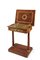 Tavolino Impero lastronato in radica di olmo, filettato in ottone, doppio piano rettangolare ribaltabile, il primo rivela scrittoio con tre riserve in cuoio verde e scomparti porta calamaio e penne, secondo rivela tavolo da lavoro con specchio e compartimenti vari, gambe a colonna scanalata su base rettangolare, applicazioni con capitelli in bronzo. Inizio secolo XIX (cm 71x82x51) (difetti)