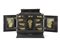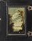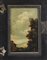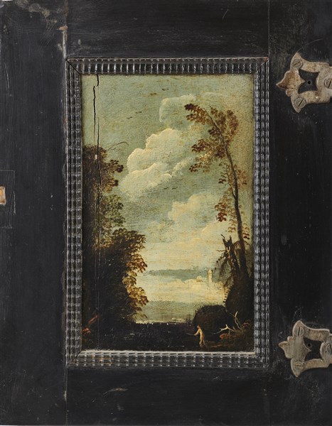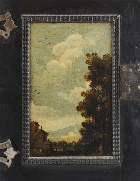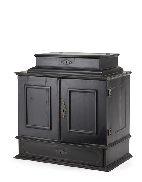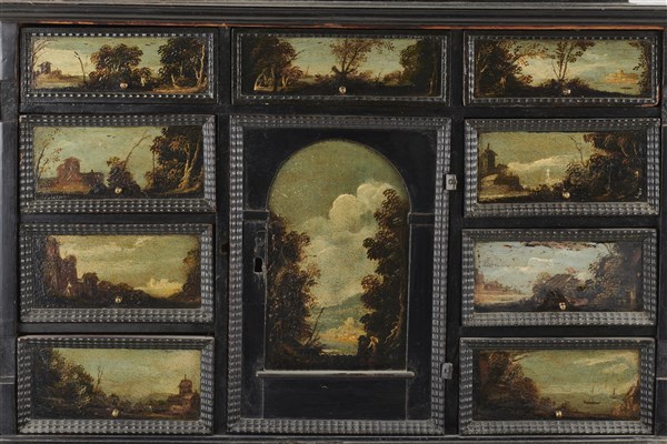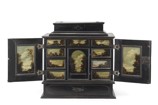 Monetiere in legno ebanizzato a due ante e un cassetto sul fronte e un'anta sul piano superiore, interno a nove cassetti e antina con pannellature dipinte a paesaggio. Olanda, secolo XVII (cm 44x48x23) (difetti e restauri)