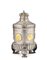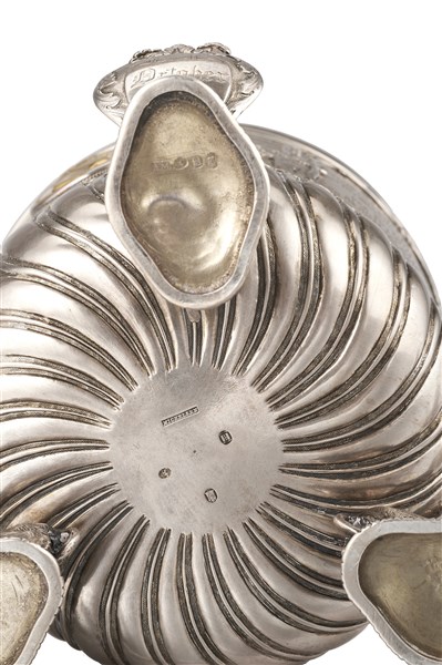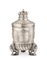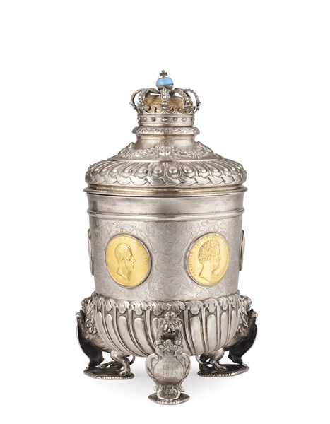 Vaso con coperchio in argento sormontato da presa a corona traforata, sbalzato a baccellature, foglie ritorte e volti muliebri raccordati da festoni, piedi in foggia di leoni coronati che reggono stemma, fascia centrale decorata da medaglie dorate con profili di sovrani e iscrizione entro riserva su fondo inciso a volute intrecciate. Copenaghen, 1850, argentiere Anton Michelsen (h. cm 30) (g lordi 1900) (difetti)